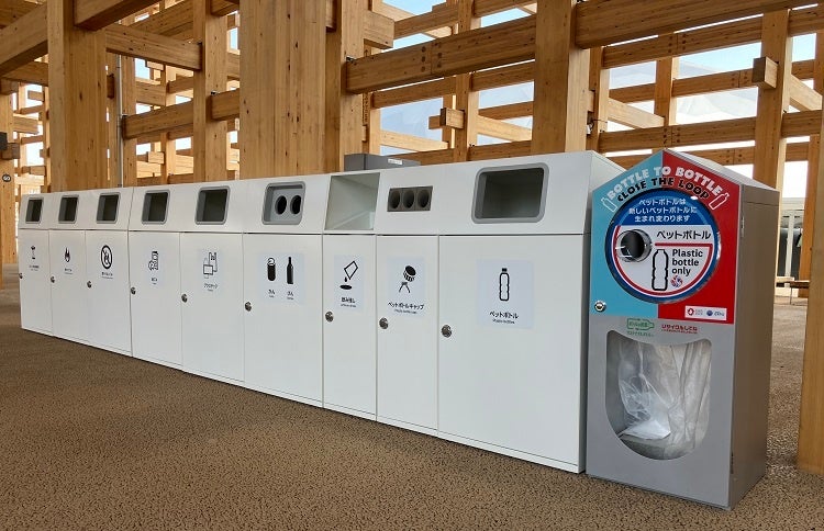 今回、効率的な「ボトルtoボトル」推進のために、ペットボトル専用回収ボックスを「3Rステーション」に設置し、2025年日本国際博覧会協会と協働しペットボトルのボトル本体、キャップ、ラベルに分別投入できる仕組みを整えています。ボトル本体を回収するボックスの投入口には両社の資源循環啓発ロゴを掲示することで、国内外から訪れる来場者に向けて使用済みペットボトルの水平リサイクルへの理解促進を図ります。