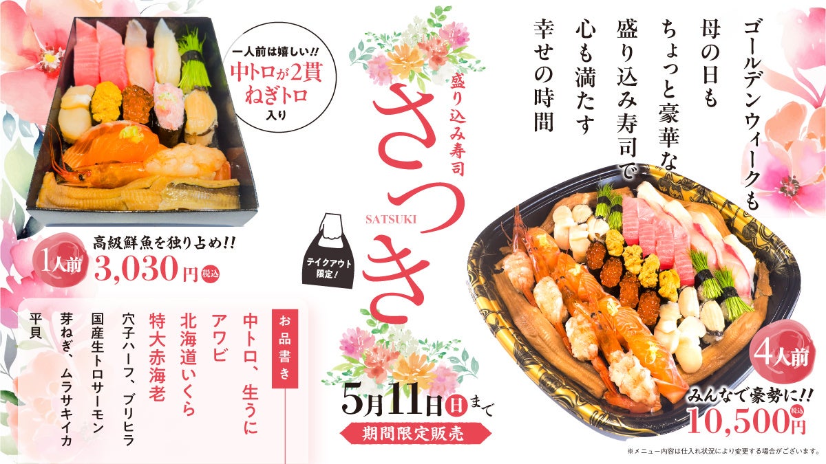 他にも、『うに軍艦』は260円(税込)、『のどぐろ塩炙り』は110円(税込)と贅沢ネタも特別価格でご用意しております!GWのご家族・ご友人との団らん時はもちろん、母の日のプチ贅沢にもぴったりのラインナップです。(※前述の金額はタイプA店舗価格となります。)