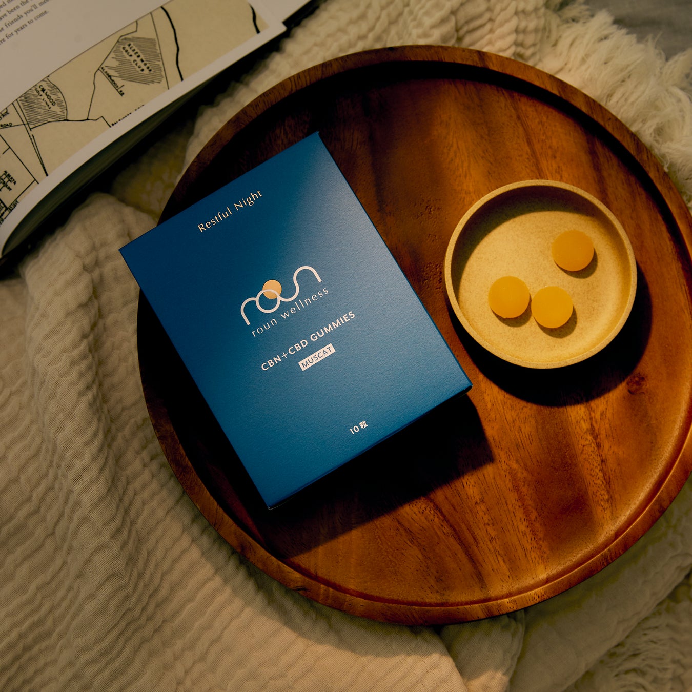 休息をサポートするレアカンナビノイドCBNとCBDを配合した、おいしく手軽に摂取できるマスカット味のグミサプリ。翌朝に向けて、こころとからだをやさしくゆるめたい方に。