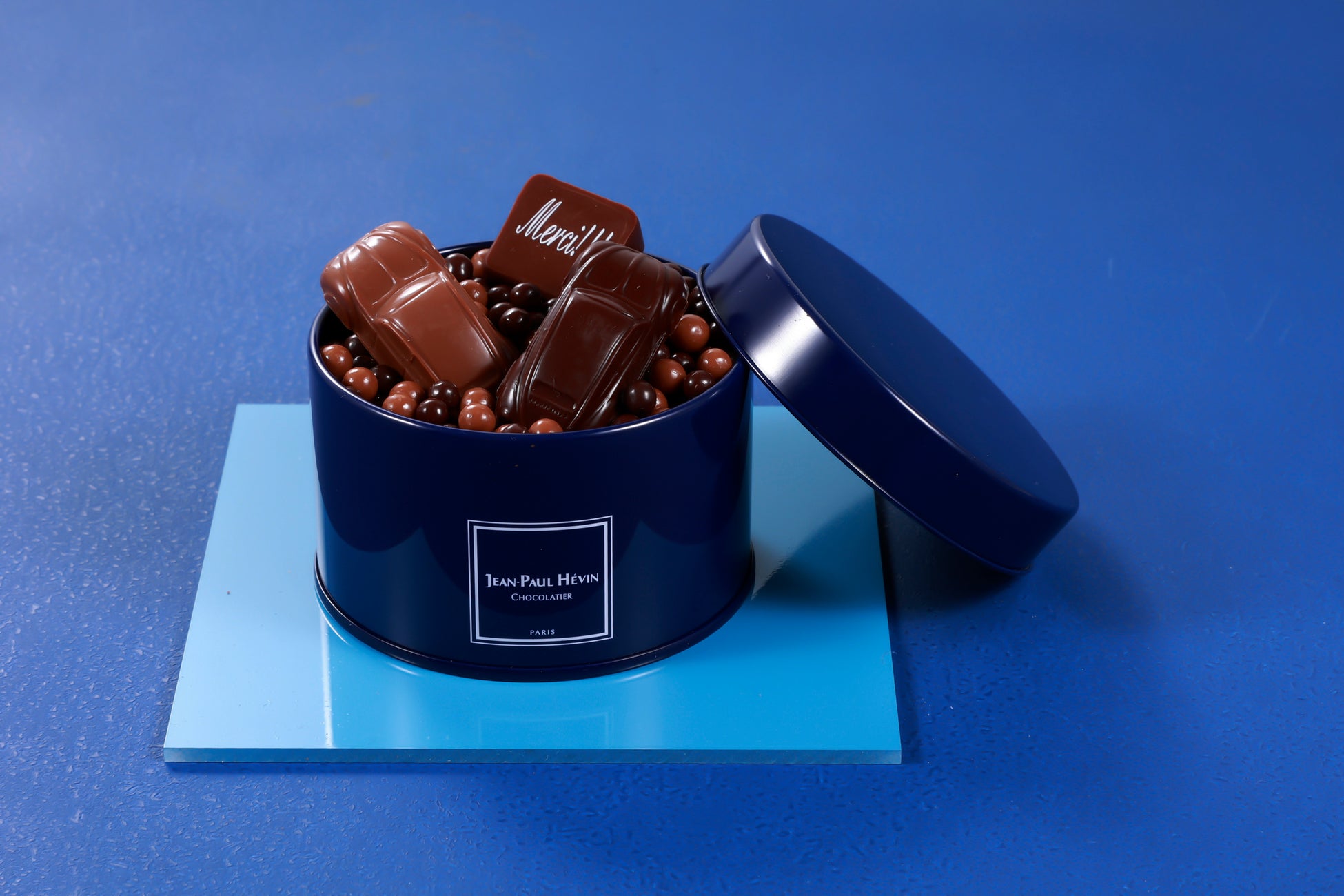 期間限定のショコラ3個(「ヴォワチュール ノワール キャラメル」「ヴォワチュール レ キャラメル」「メルシー」)と、シリアルをチョコレートでコーティングした「ペルル クラッカントゥ」をブルーの缶に詰合せ。