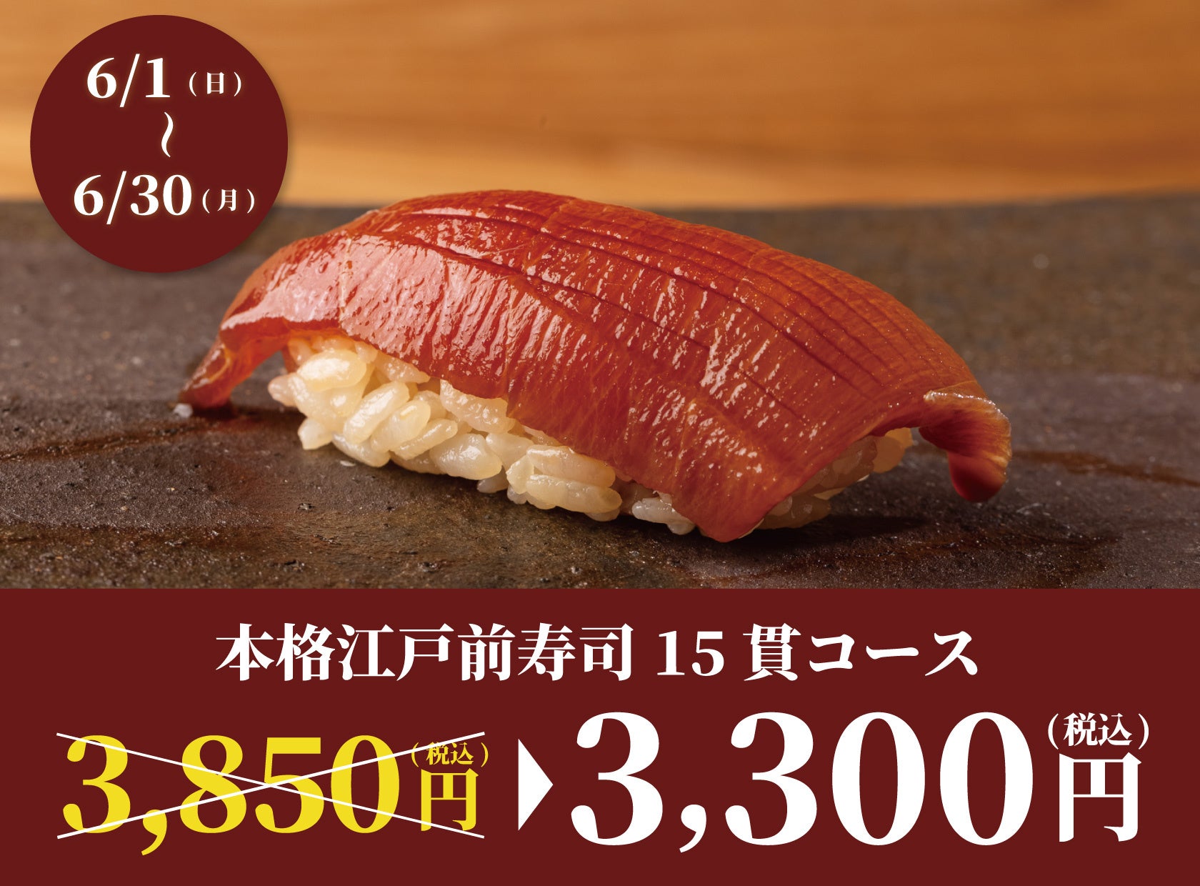 株式会社ビリオンフーズ(本社:東京都港区 代表:中村雄斗)が運営する『日本橋 すし処 二ノ宮 本厚木店』では、6月1日(日)〜6月30日(月)の期間中、本格江戸前寿司15貫コースを3,300円(税込)でお楽しみいただけるキャンペーンを開催いたします。