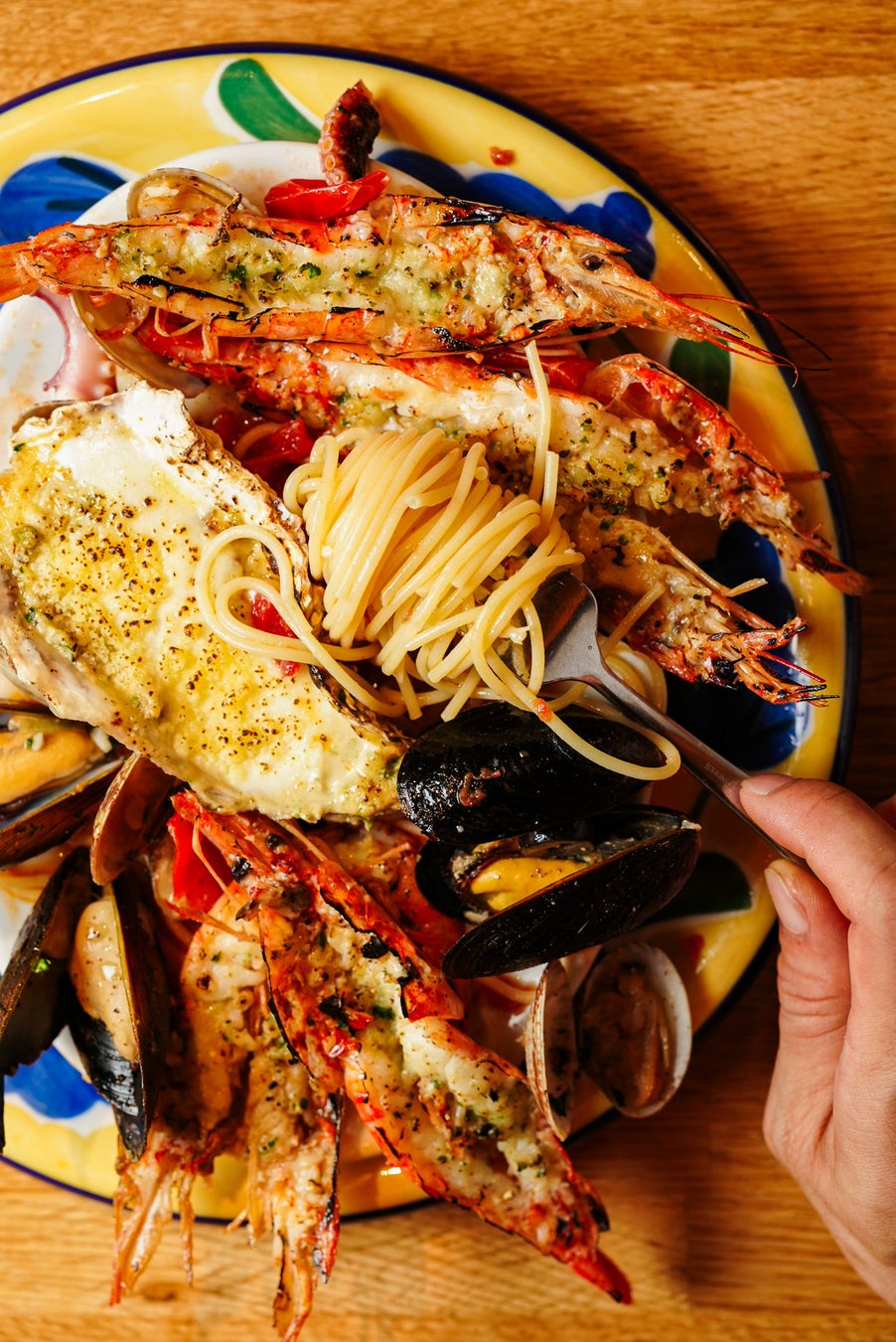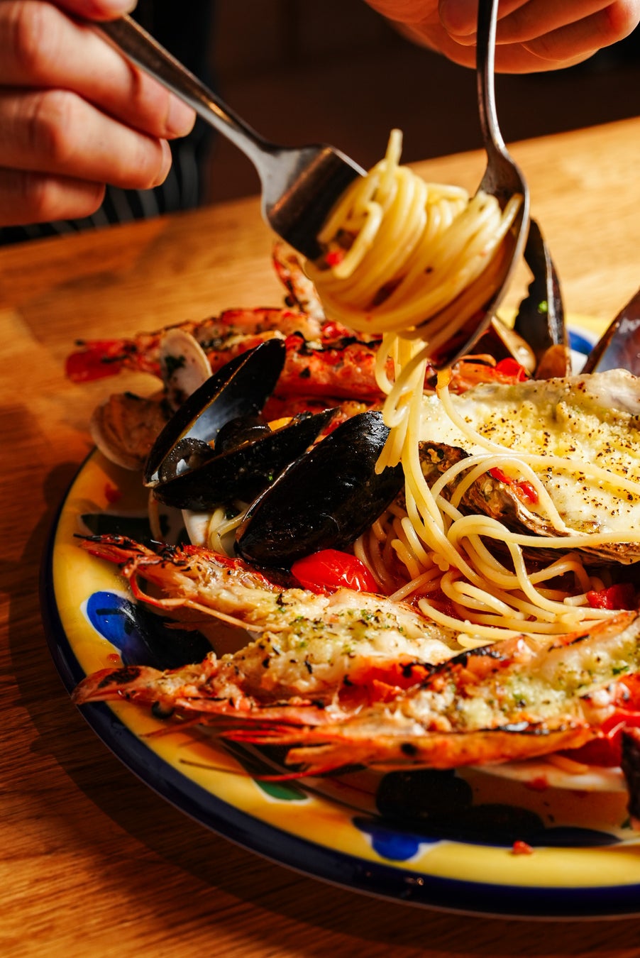 1.具材量300%:パスタが見えない、魚貝の山。。