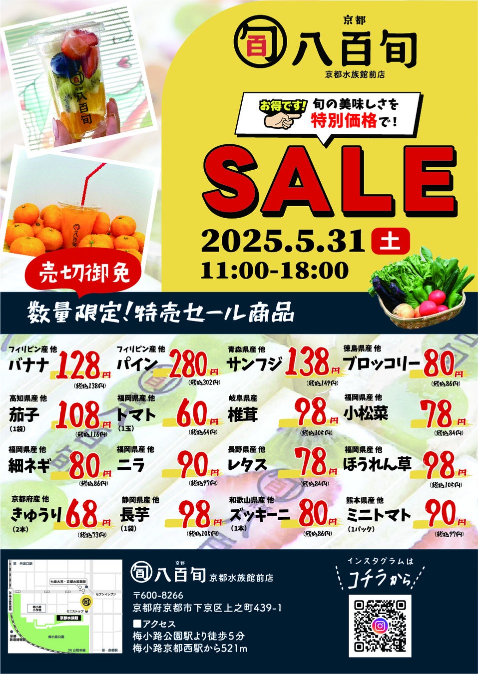 地域密着型青果店「八百旬」では、2025年5月30日(金)は嵐山店、31日(土)は京都水族館前店にて特売セールを開催いたします。