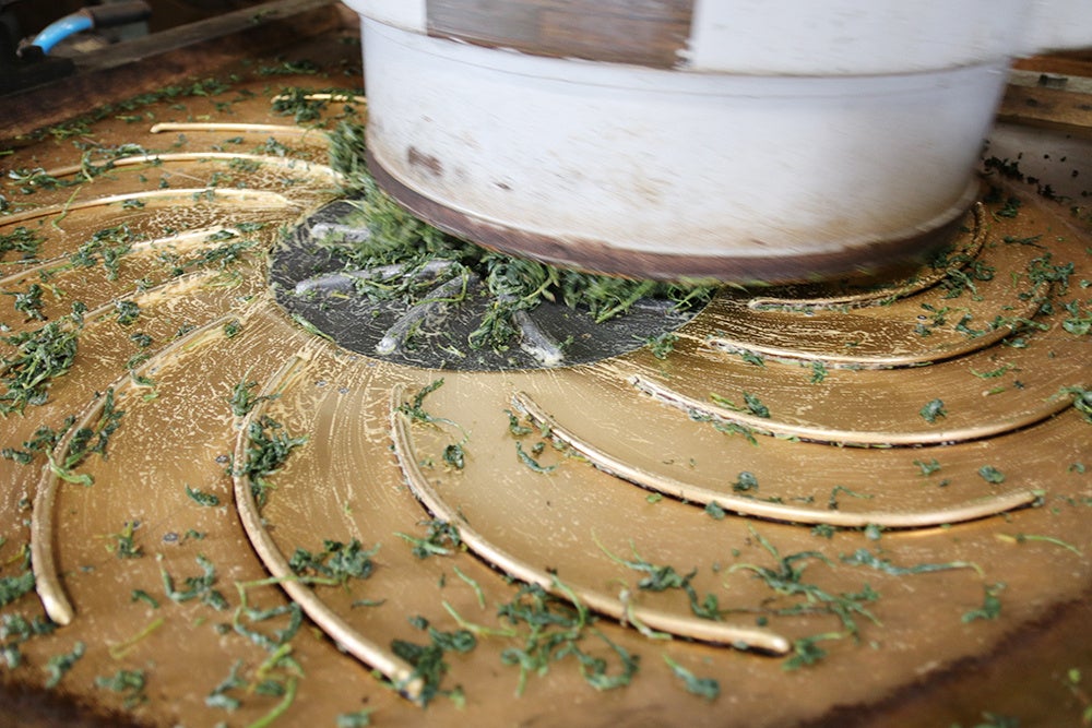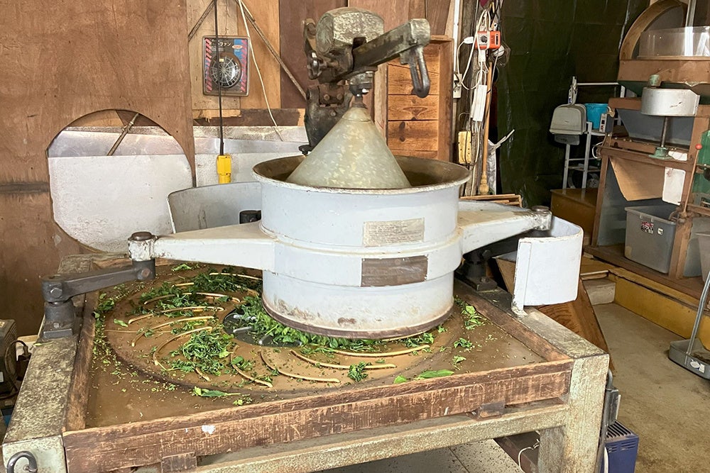 ※葉を揉む工程。圧力をかけて揉むことで茶の形状を整える。同時に、茶葉の組織や細胞を破壊し、酸化酵素を含んだ茶汁を出して、空気に触れさせることで酸化発酵を促す。