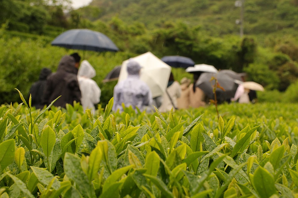 小雨が降る中での見学となりましたが、瑞々しい茶畑を見ていただくことができました。