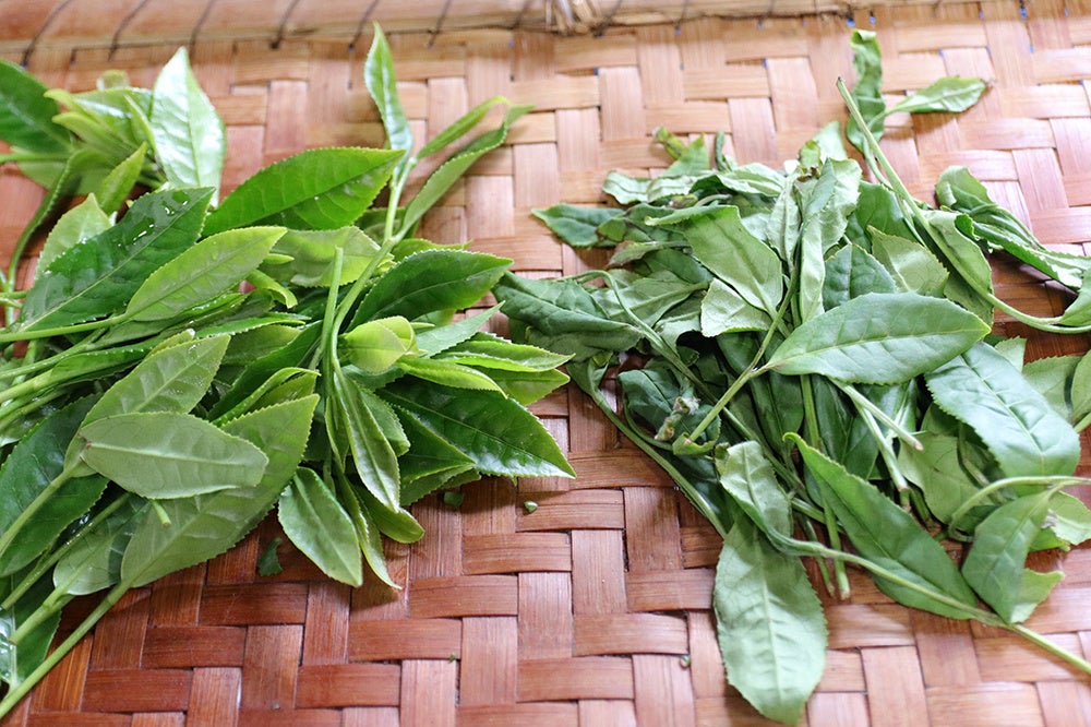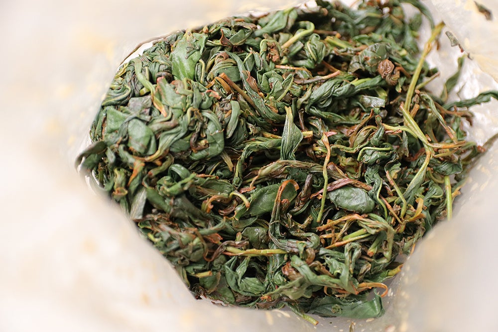 萎凋前の生葉と比べると、水分が抜け萎れている様子がよくわかります(写真右)。