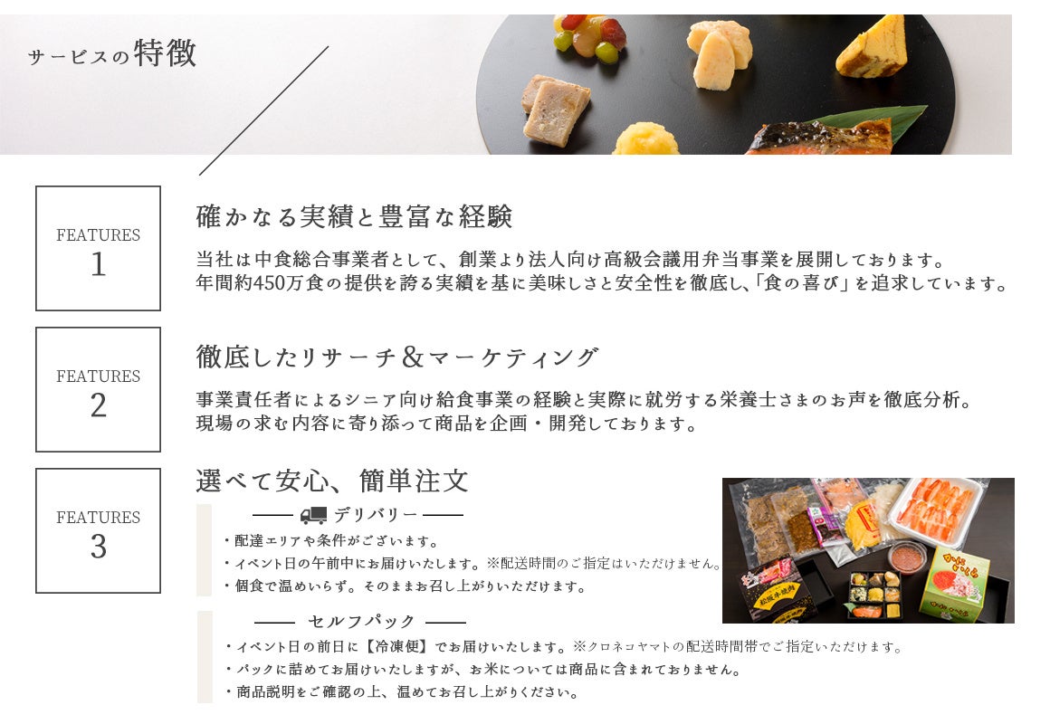 現在47都道府県から選りすぐりの飲食店にご加盟頂いており、各飲食店にてこだわり抜いたお弁当を日本全国へデリバリーするサービスを展開している他、出張ケータリング専門サービス「ケータリングセレクション」を運営。またコロナ禍においては、フードプロデュース事業や、中食コンサルティング、バーチャルレストランブランド提供、冷凍自動販売機「ど冷えもん」販売など、時代に合わせた飲食店の支援サービスも展開しております。