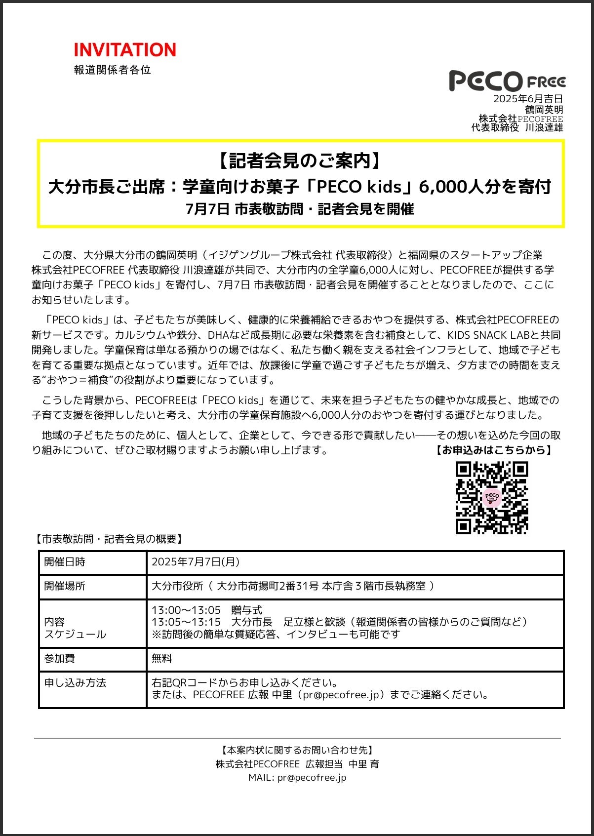 福岡発の学⽣向けフードデリバリーアプリ「PECOFREE(ペコフリー)」を運営する株式会社PECOFREE(本社:福岡県、代表取締役:川浪達雄)と、大分県大分市の鶴岡英明(イジゲングループ株式会社 代表取締役)が共同で、大分市内の全学童6,000人に対し、PECOFREEが提供する学童向けお菓子「PECO kids」を寄付し、7月7日 市表敬訪問・記者会見を開催することとなりました。