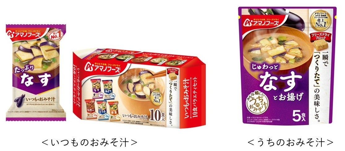 フリーズドライみそ汁は、お湯を注ぐだけで手軽に本格的な味わいと具材の香りや食感が楽しめる商品です。おみそ汁1杯から調理ができ、時短ニーズの高まりや個食化の進行などを背景に近年人気を集めています。「いつものおみそ汁」シリーズは、具材にあわせて最も相性の良い“みそ”と“だし”を選び、こだわって作った、毎日食べたくなるおみそ汁をコンセプトに2014年から展開している「アマノフーズ」の主力商品です。