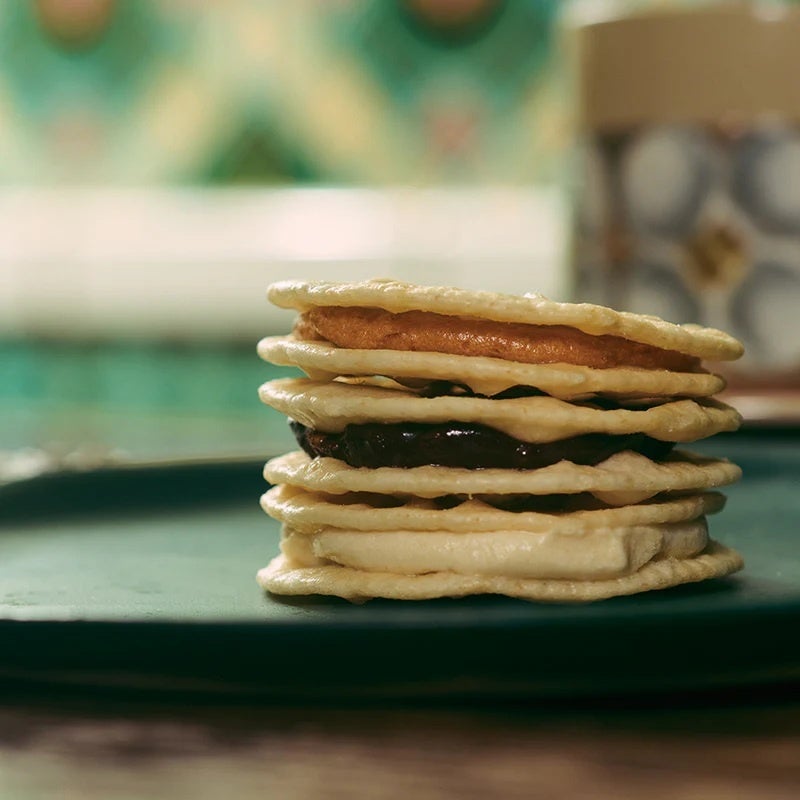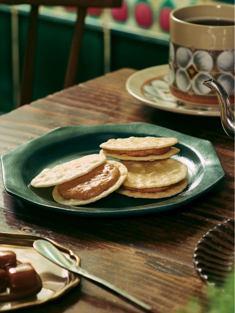 パリッと軽やかな煎餅に、洋菓子の発想で生まれた口溶けなめらかなクリームを挟んだ「煎餅サンド」。キャラメルの配合は調整を重ね、ビターで芳醇なクリームに仕上げました。