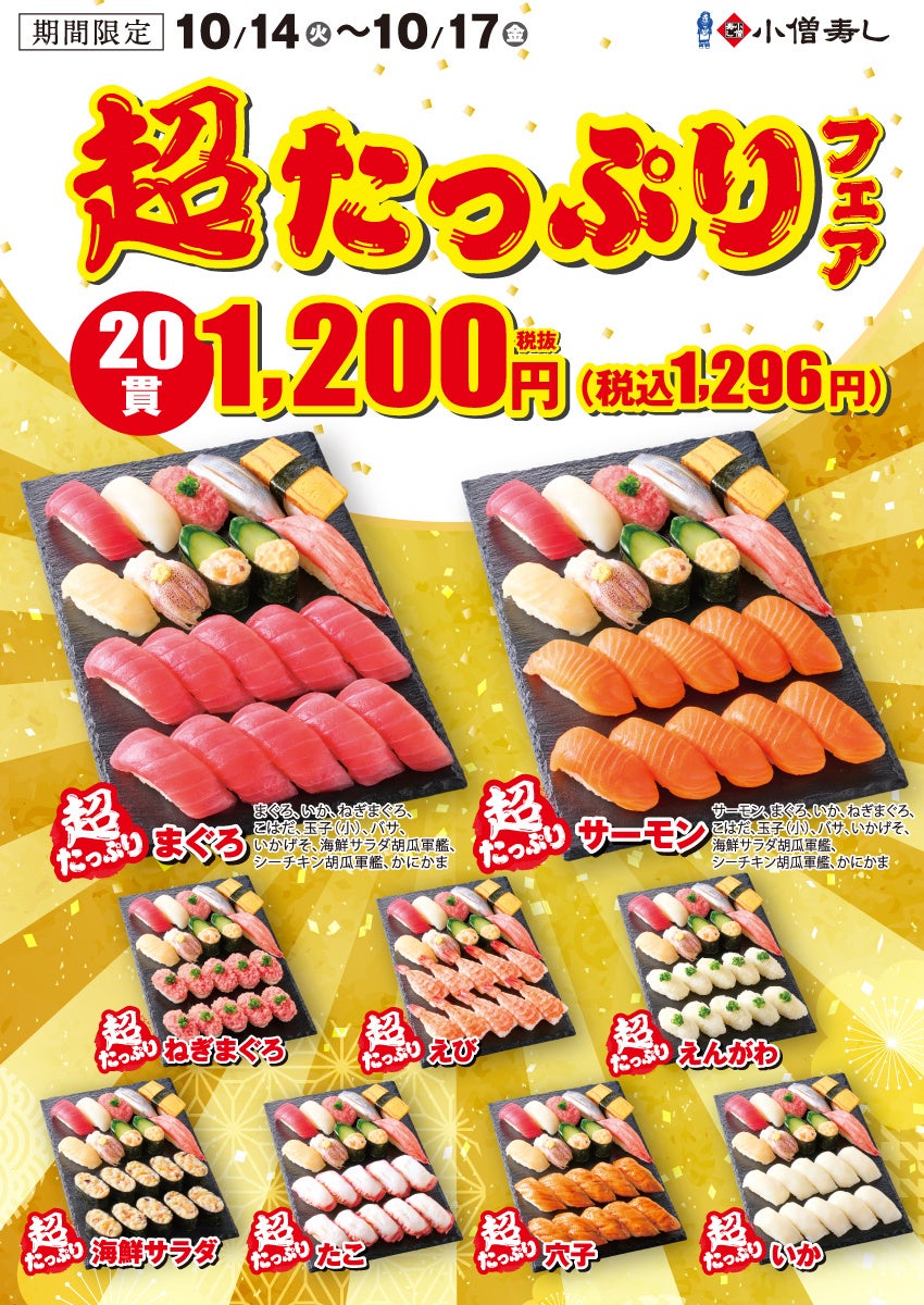 KOZOホールディングス株式会社の子会社である株式会社小僧寿しは、持ち帰りすし店「小僧寿し」にて、10月14日(火)~17日(金)の平日期間限定で『超たっぷりフェア』を販売します。(※店舗により未実施の場合がございます)