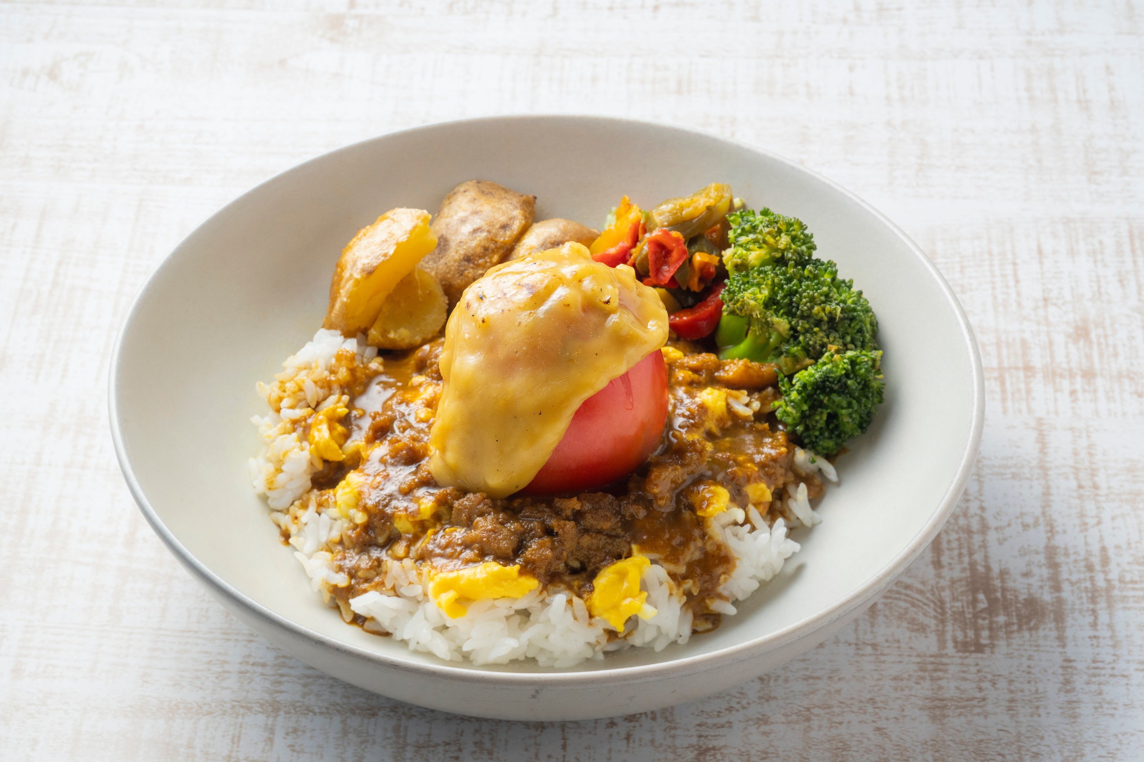 スパイシーなカレーに植物性チーズやトマトがのった、