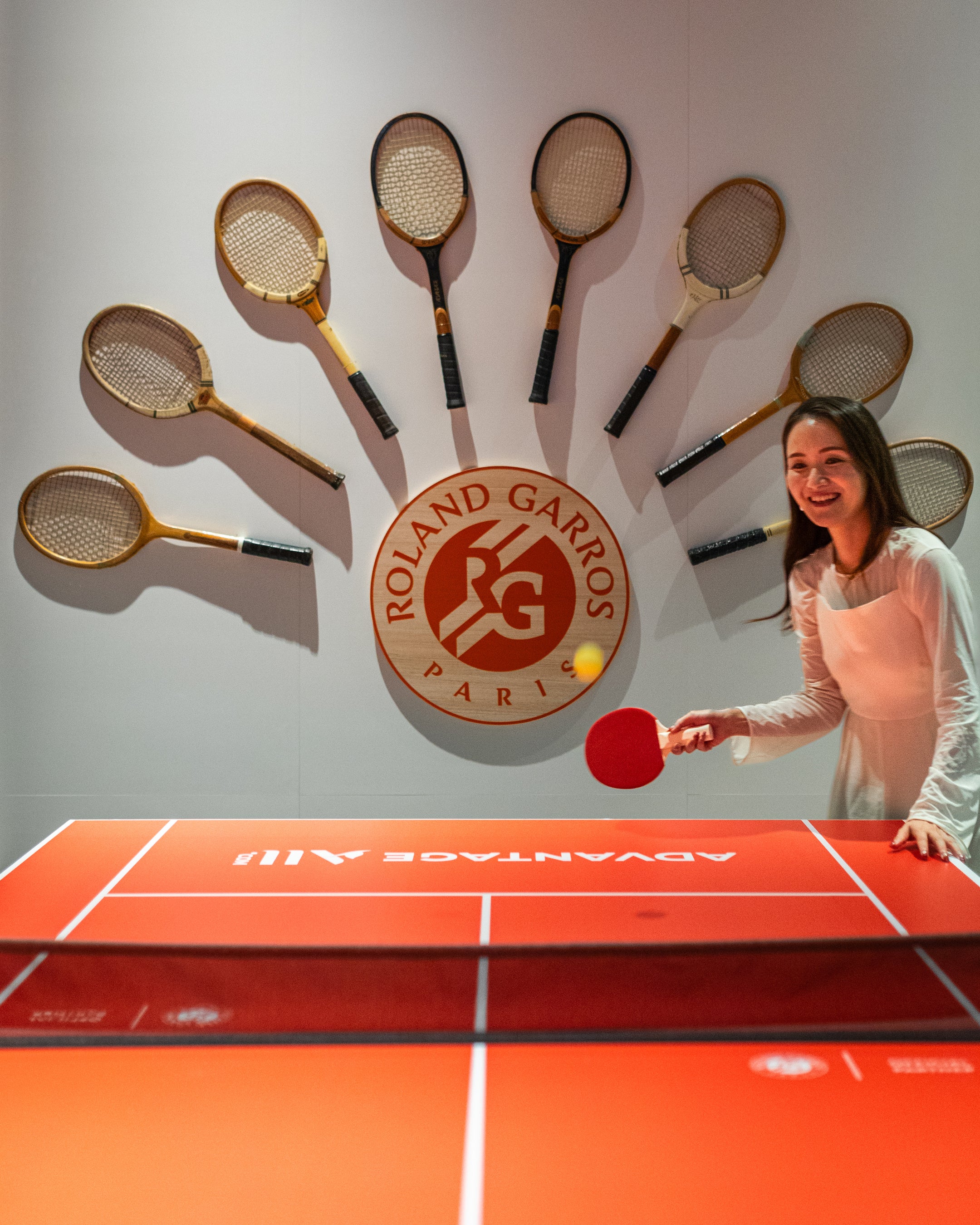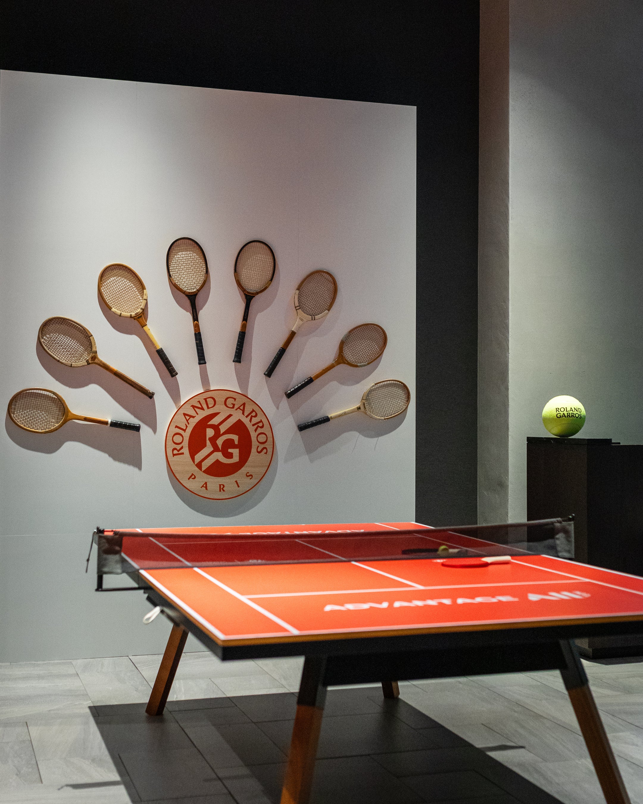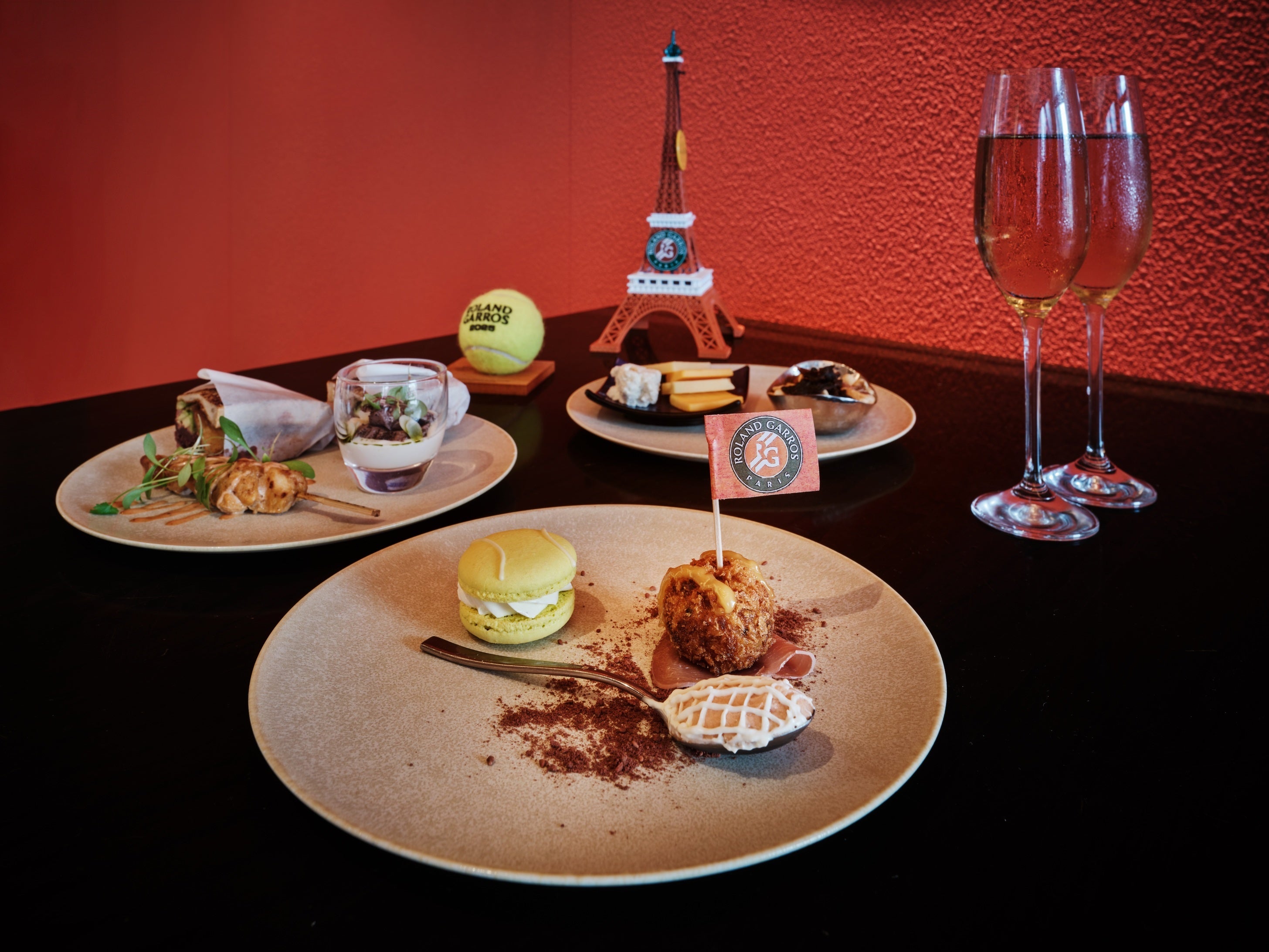 館内には、全仏オープンの軌跡やテニスモチーフの装飾、そしてパリの名門トーナメントを想起させる演出が随所に施されています。ハイティーを堪能した後は、レッドクレーコートに変身した卓球台でのテーブルテニスを通して、ローラン ギャロスの世界に浸る体験をお楽しみください。