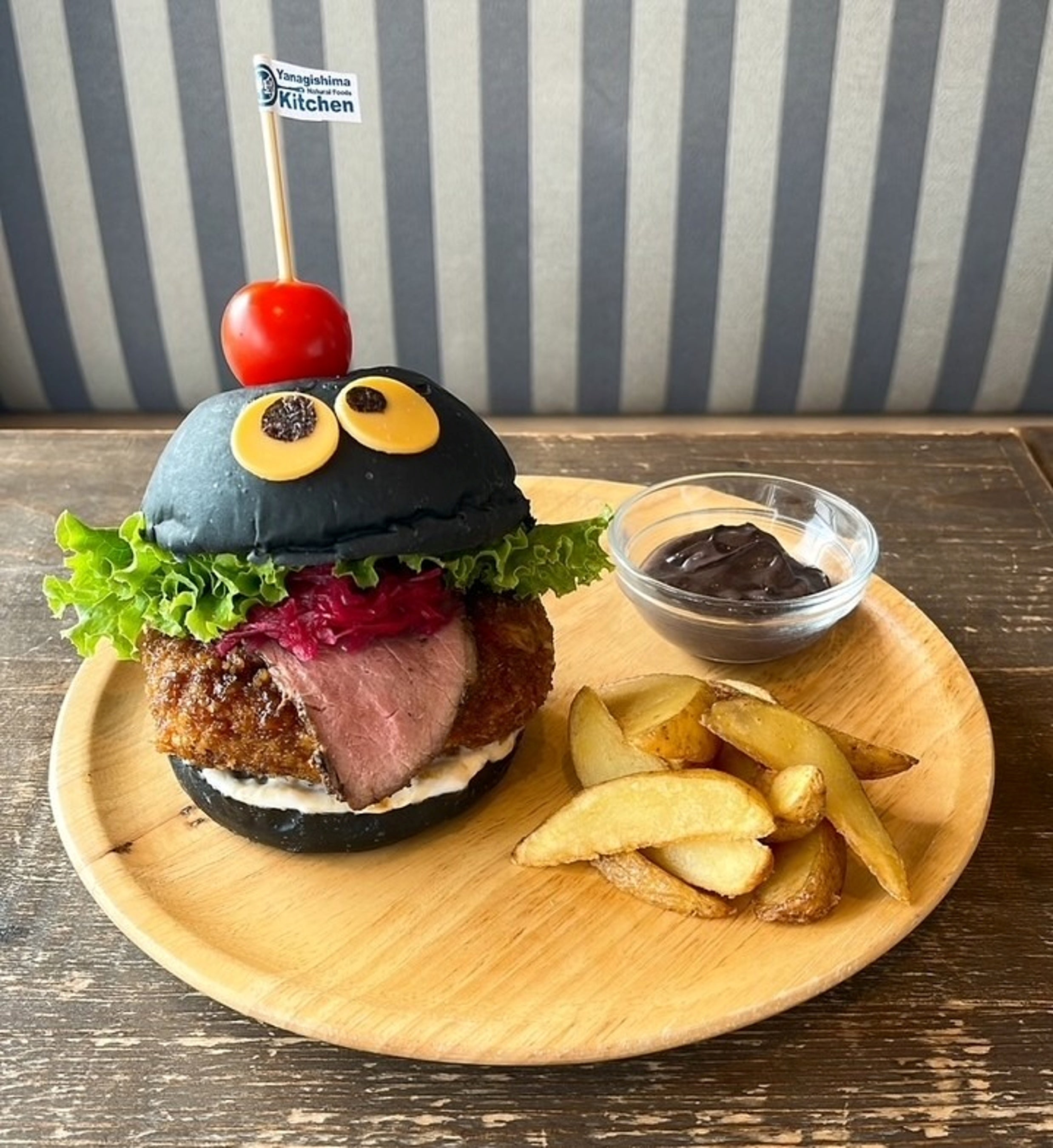 特徴 :ハロウィン感満載のユニークな見た目。黒いバンズには竹炭を使用。竹炭パンはデトックス効果、ミネラル補給、食後血糖値上昇抑制効果や抗酸化作用が期待されています。具材には大豆ミートを使用したメンチカツを挟み、舌に見立てたローストビーフがリッチ感を演出。サイドにそえられたフライドポテトは真っ黒な謎のソースでお楽しみください。