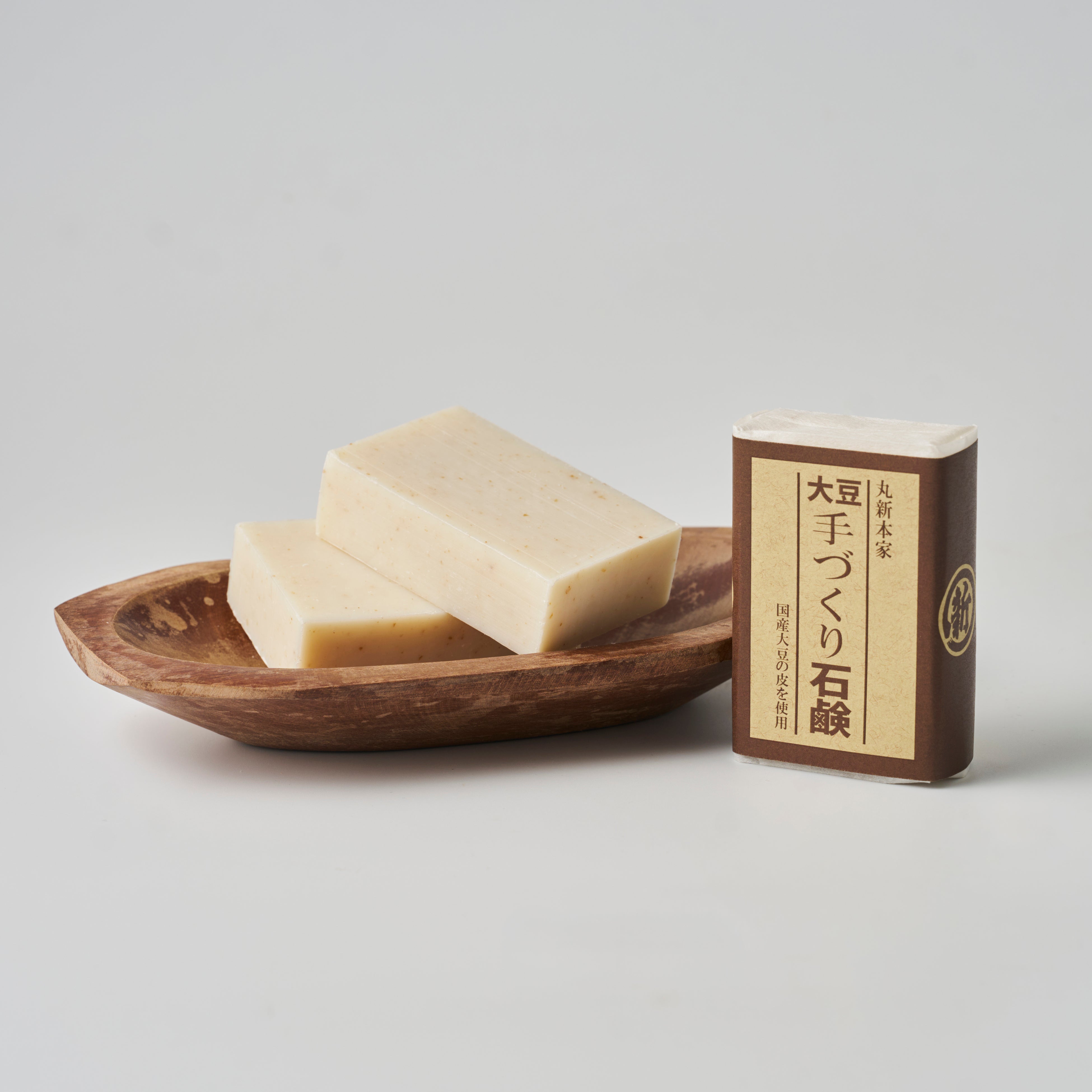 以前にも大豆の皮を使用した石鹸を販売しておりましたが終売しており、「もう一度新たなかたちに生まれ変わらせて、お客様のもとへ届けたい」という想いが、再発売への原点でした。この想いをかたちにしてくださったのが、創業(1955年)より無添加石鹸づくりを続けている丸菱石鹸株式会社です。防腐剤・品質安定剤・香料を一切使用せず、素材の力を活かした石鹸づくりは、当社の「シンプルな材料で、丁寧につくる」という理念と深く通じ合うものでした。