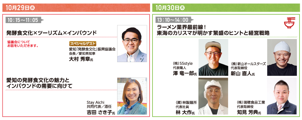 中部エリアで活躍する食のプロを迎え、「発酵」をテーマにしたセッションをはじめ、東海のラーメン業界のカリスマたちが集結する注目のセミナーなど、多彩なプログラムを実施します。さらに、本展示会のセミナーには、愛知県知事 大村 秀章 氏も登壇いたします!