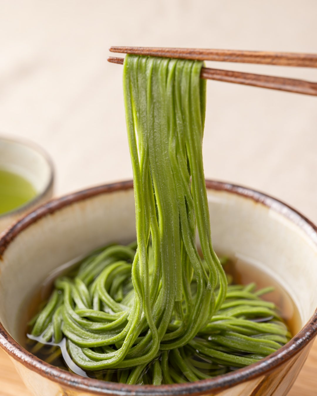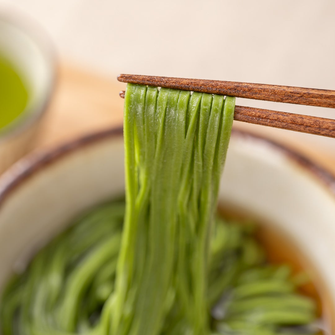 日本茶専門店としての品質と、製麺の匠の技を融合させることで、抹茶の美しさを一筋の麺で表現することに成功しました。