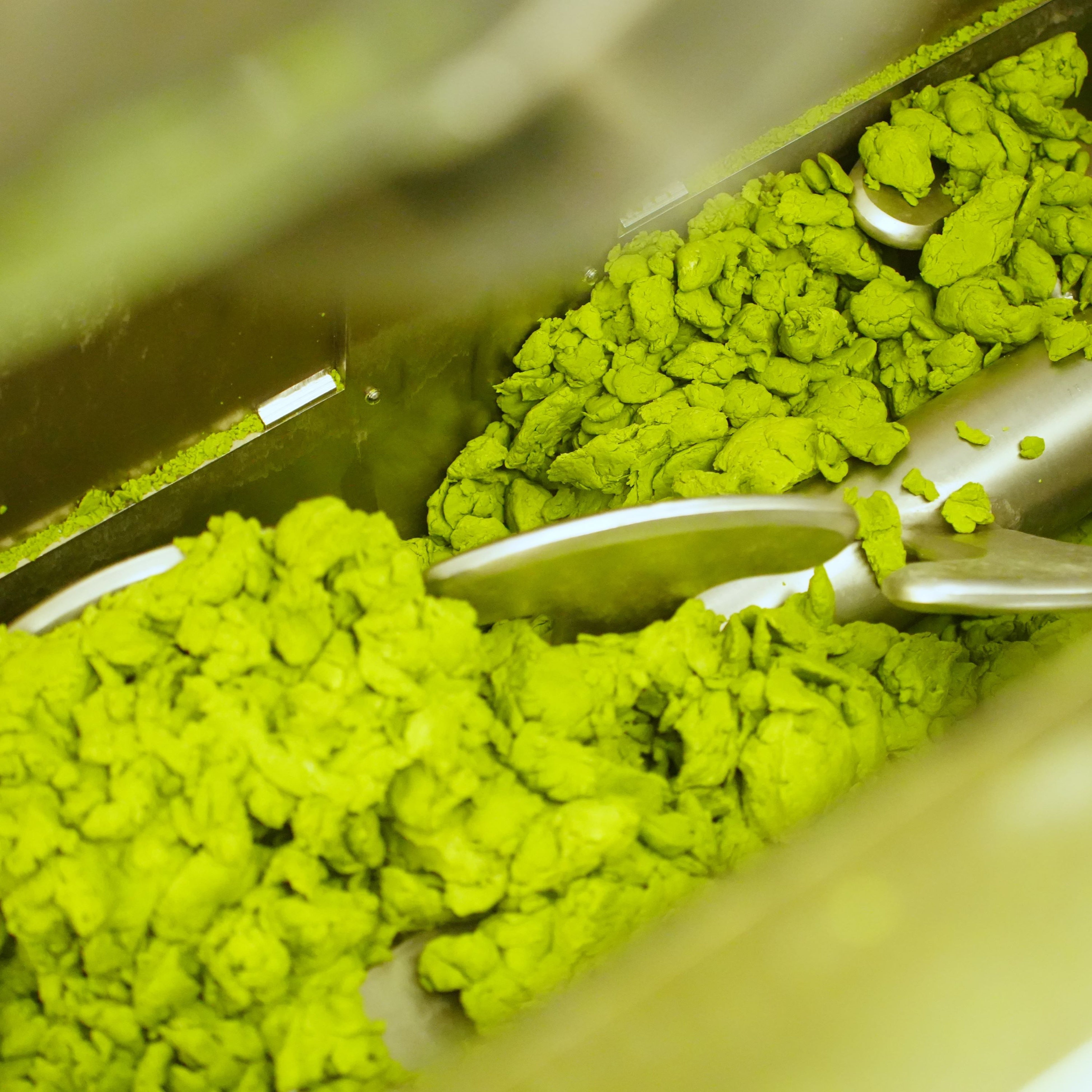 使用するのは、上質な国産小麦粉と、祇園辻利厳選の抹茶。老舗製麺会社の配合比の中でも類を見ない抹茶配合率5%の特別仕様で、これ以上の濃度では生地がまとまらなくなるという“限界濃度”ながら、10分間かけてムラなく均一に練り込み、抹茶の色・香り・味わいをしっかりと生地全体に行き渡らせます。その日の気温や湿度によって異なる生地の状態を、熟練の職人たちが感覚で微調整しながら仕上げる。この工程こそが、機械化された現代においても受け継がれる「人の技」です。