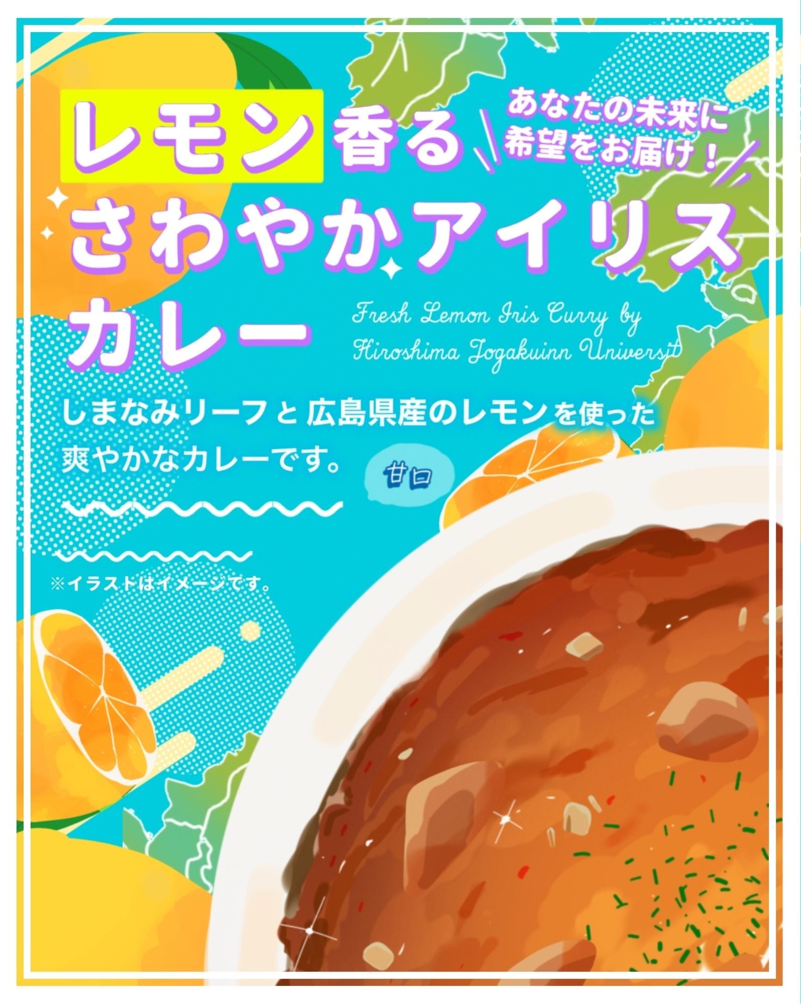女子大学生らしいフレッシュさを表現した、爽やかな味わいのヘルシーカレー。さっぱり食べられるよう、ささみと広島県産ちりめんじゃこを使用し、レモンと広島県尾道産しまなみリーフで風味にアクセントを加えました。シンプルだけど奥深い、食べる人に元気を届けるカレーです。※46.5キロのフードロス削減に貢献