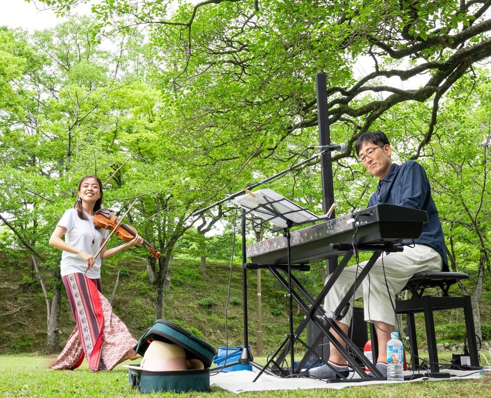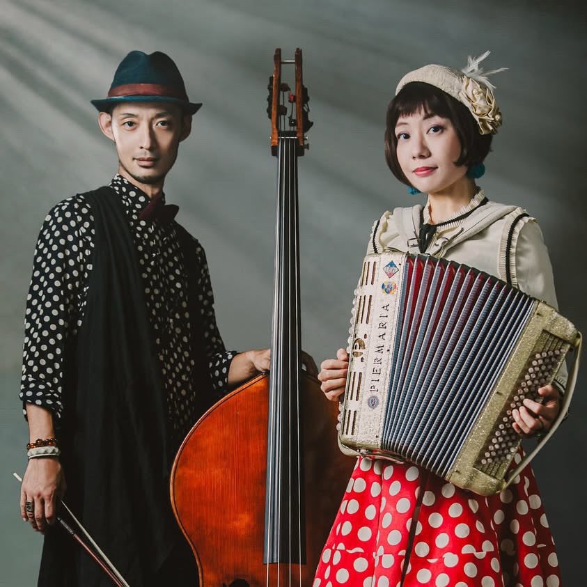 五月エコ(ボタンアコー ディオン)と新井洋平(コ ントラバス)。二人が奏でる音楽は、人に寄り添いながら日常の景色を物語 へと変えていく。オリジナル曲と世界の伝統曲を織り交ぜ、茶席やギャラリーなど特別な空間でも演出を行ってきた。沖縄での4年間を経て、現在は関西を拠点に活動を再開している。
