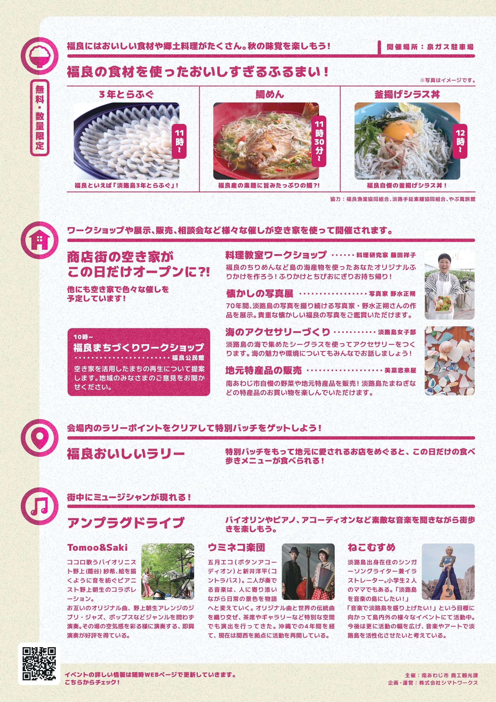 古くから漁師の町として栄え、そうめんや海産物、農産物など豊かな食文化を育んできた、みなとまち 福良。この町の商店街を舞台に、食の新しいまちづくりが始まります。第一歩となる今回のイベントは、食、音楽、歴史を街歩きをしながら楽しめます。住民の方も観光客の方も一緒に楽しめる、ワクワ クいっぱいの一日。ぜひ足を運んで、福良の魅力を体感してください。