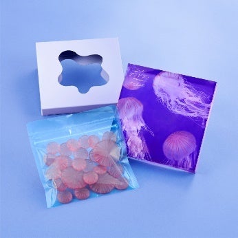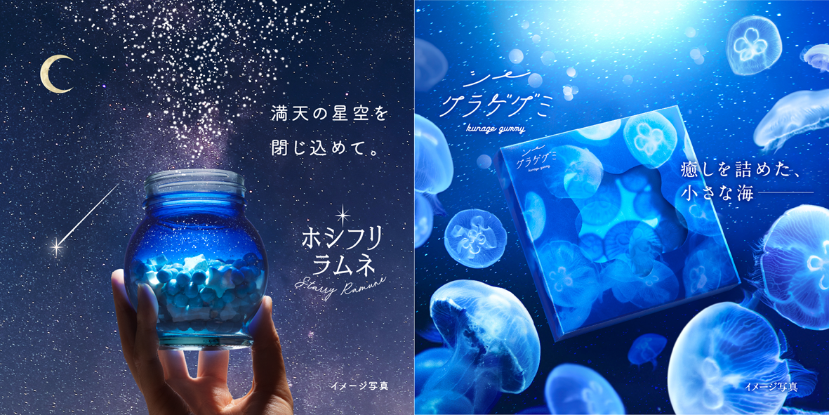 「ホシフリラムネ」は、星空がお菓子になって降ってきたような、輝く星と夜空をイメージしたラムネです。幻想的な見た目のかわいらしさや、「星空を集める」という世界観が受け入れられ、SNS を中心に話題となり発売から 9 日後に初回生産分が完売した人気商品です。「シークラゲグミ」は「癒しを詰めた、小さな海」をコンセプトに、素敵な魅力いっぱいのクラゲを表現したグミです。まるで海のようなパッケージを開き、海で浮かんでいるようなクラゲグミに癒されながらも、クラゲの傘をグミで味わう非日常体験を味わうことができます。グミで楽しむ非日常体験とそのユニークなビジュアルは、SNSで映えると、クラゲ好きの方を中心に好評の声をいただいています。