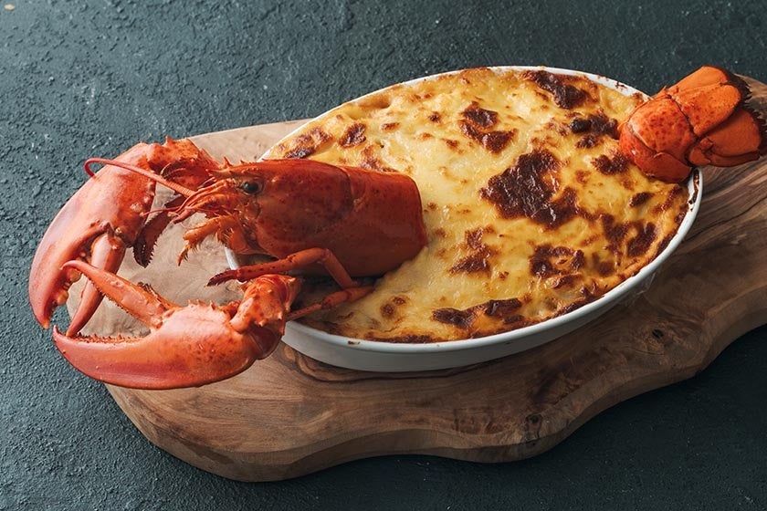 ロブスターを一尾使った、ボリュームのあるグラタン。バターでソテーしブランデーで香り付けしたホタテ、ゆでたマカロニと合わせ、スライスマッシュルーム入りのホワイトソースにチーズソースを重ねました。アメリカで愛される「マカロニ&チーズ」をイメージした、世代を問わず食べやすい味わい。そのまま食卓に出せる陶器のうつわ入りです。