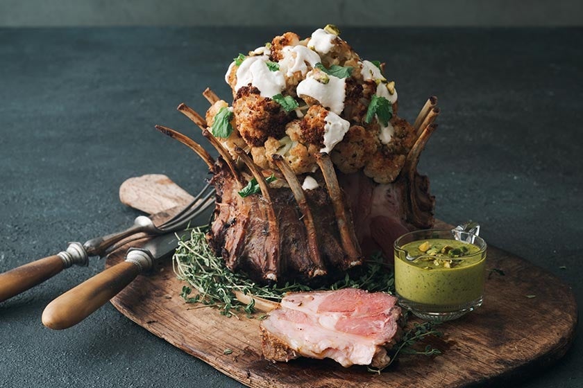 心沸き立つメインディッシュが新登場。スパイスとハーブを擦り込んだラムラックは、王冠状にしてオーブンへ。低温で中までじっくりジューシーに焼き、さらに高温で表面を香ばしく焼きあげます。上にはホロホロにローストしたカリフラワーを添えて。お肉はピスタチオミントソース、野菜はヨーグルトタヒニソースでお召しあがりください。