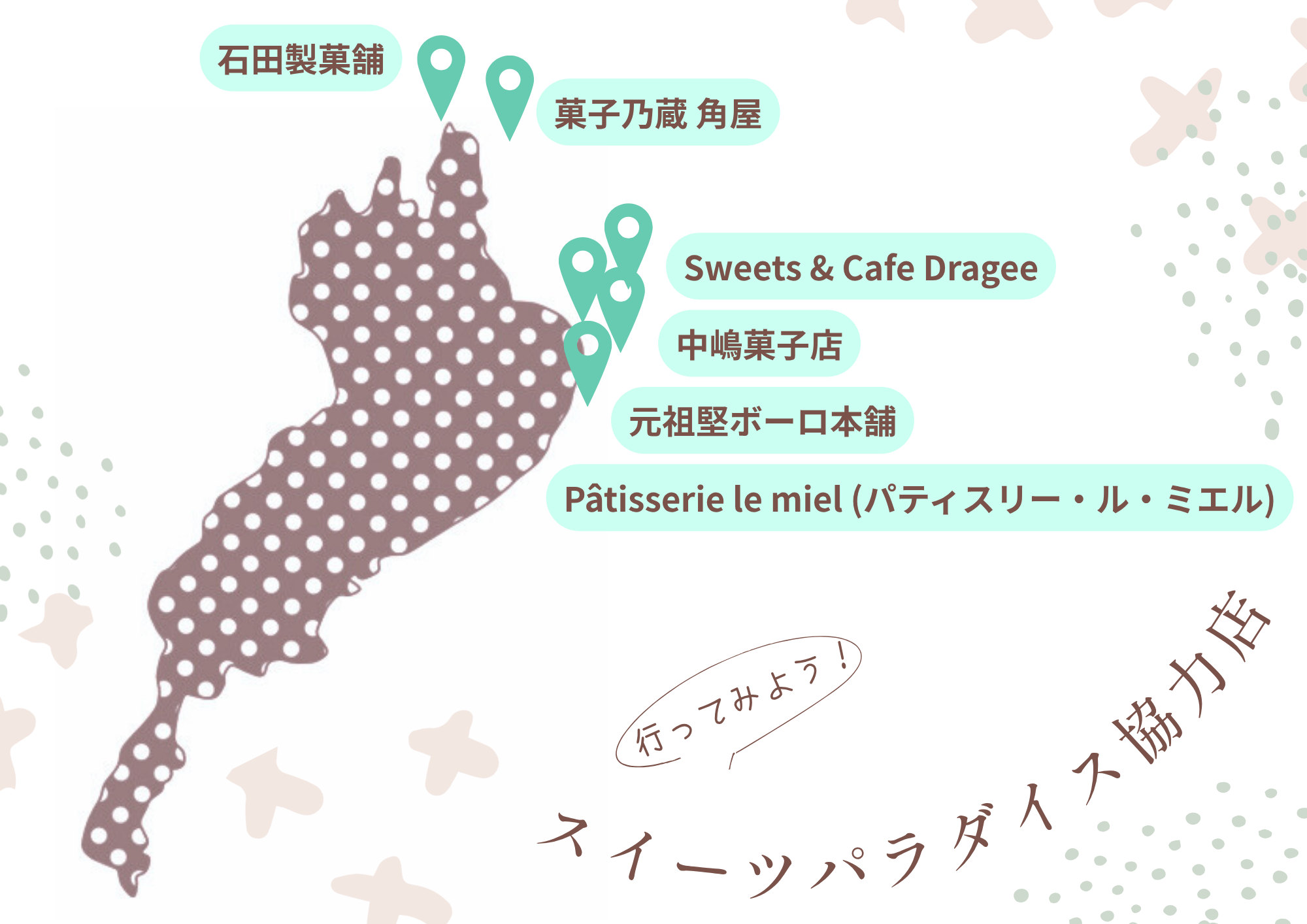 通常のウェイポイントとは別に、地元スイーツ店を巡る特別な「スイーツWAY POINT」をご用意しました。「スイーツパラダイス」協力店の中から厳選された5店舗が対象となります。