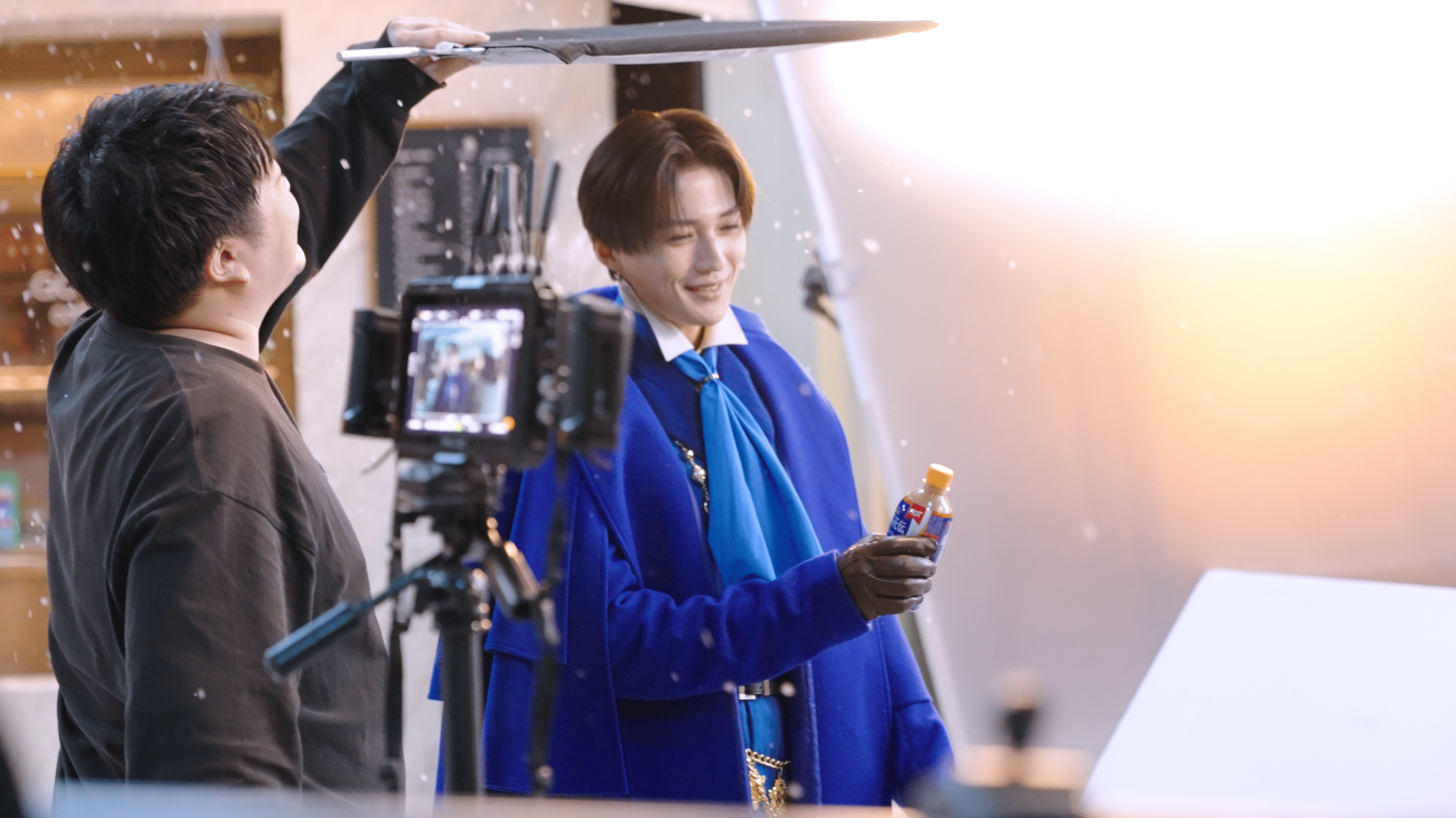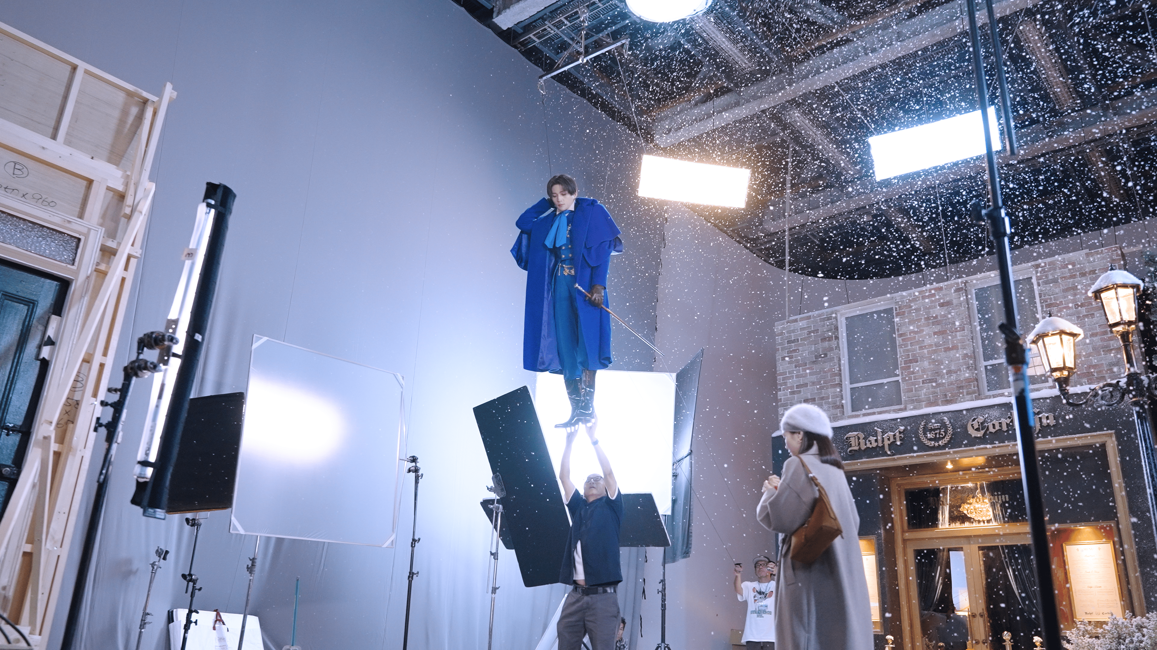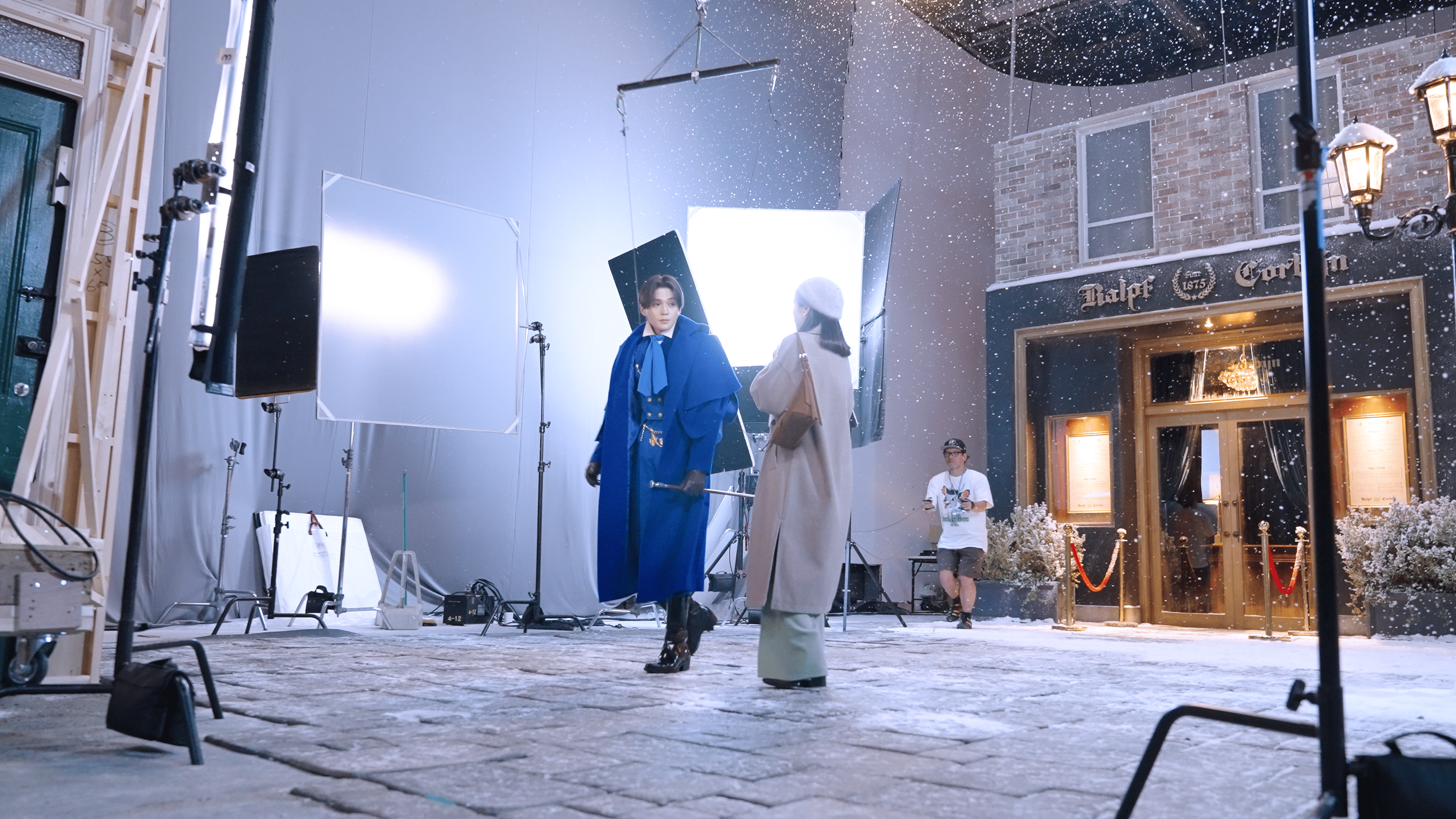 冬の街を再現したスタジオには、本物さながらの雪が降り注ぎます。そんな冬仕様のスタジオに興味津々な様子の八木さん。撮影の合間には、八木さんが持つスティックで雪の積もる地面に絵を描くなど、無邪気な姿を見せる場面も。幻想的な冬の世界に溶け込む姿とのギャップが印象的で、現場は常に和やかな雰囲気に包まれていました。