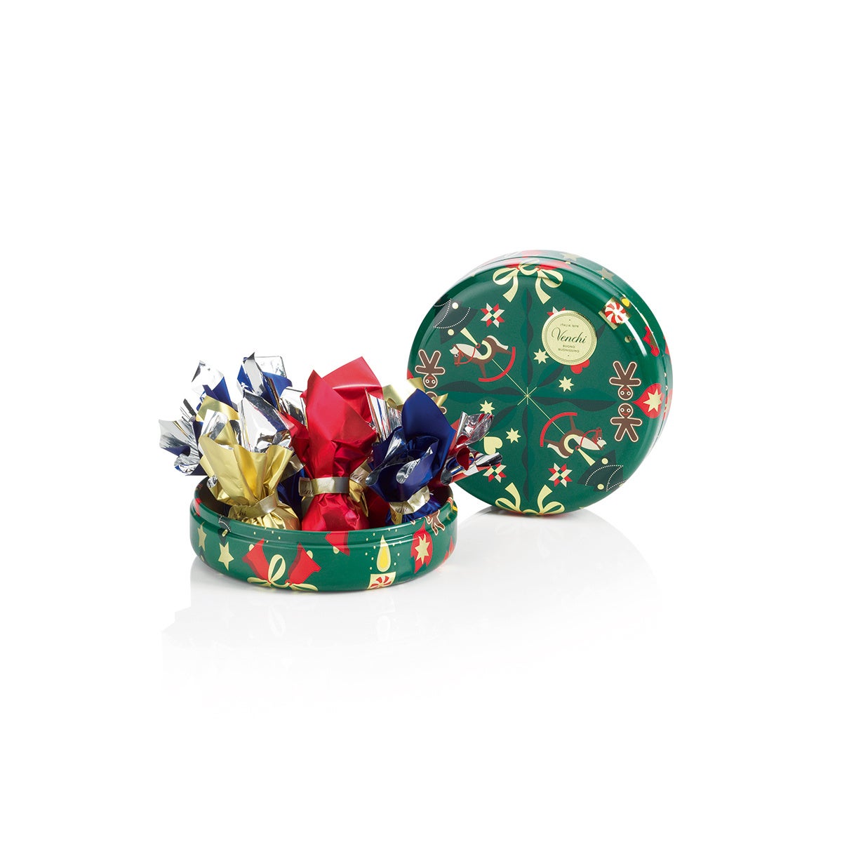 グリーンをベースに様々なクリスマスモチーフが描かれたラウンド型のギフト缶。きらめく彗星をイメージしたチョコレート「コメッツ」7個をアソート。ふたを開いた瞬間、彗星たちがクリスマスムードへ導きます。