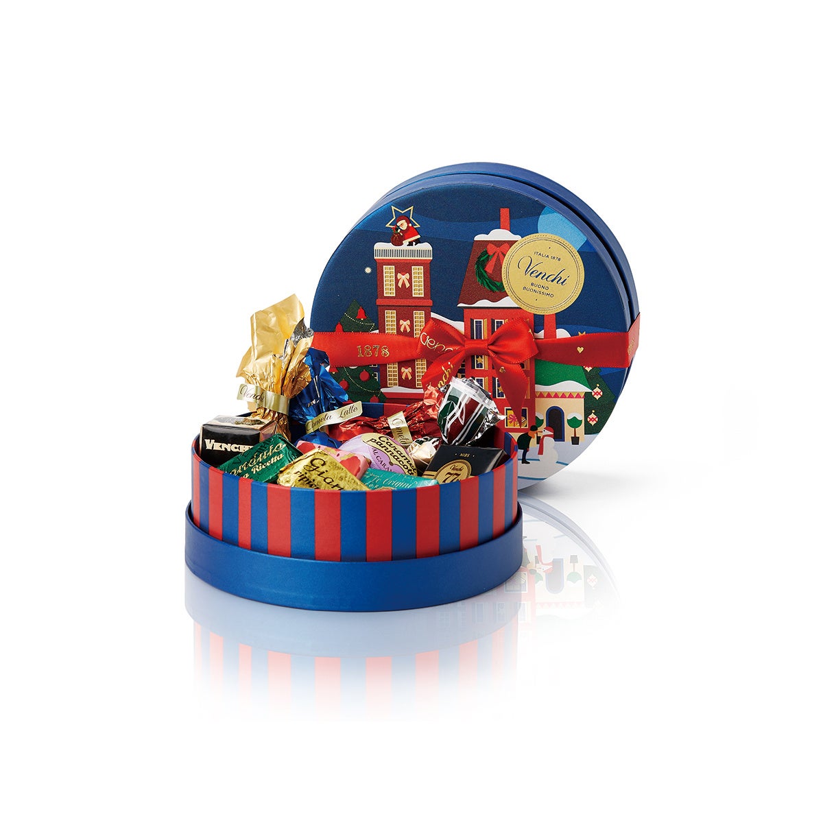 クリスマスの街並みが描かれたシックなデザインの2025年クリスマス限定バージョンのミニブック缶。ヴェンキを象徴するチョコレート「チョコビア」6個をアソート。