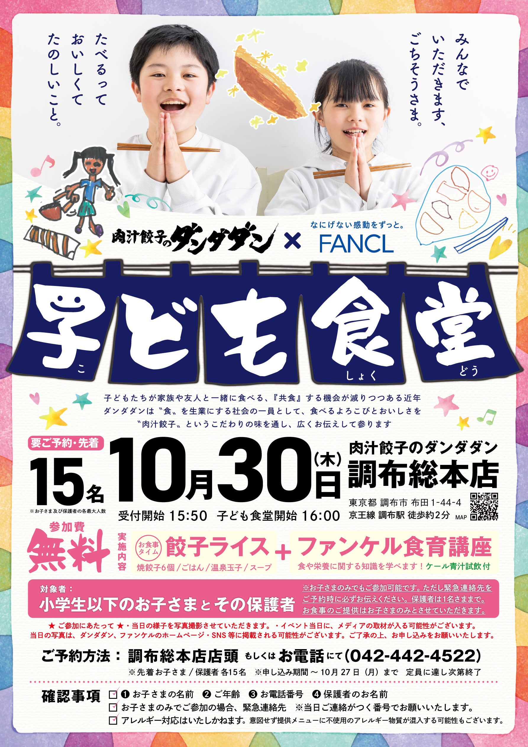 この度、2025年10月30日(木) に、肉汁餃子のダンダダン調布総本店にて、肉汁餃子のダンダダンと株式会社ファンケル(本社:横浜市中区、代表取締役社⻑ 執行役員:三橋 英記)で「子ども食堂」を共催します。