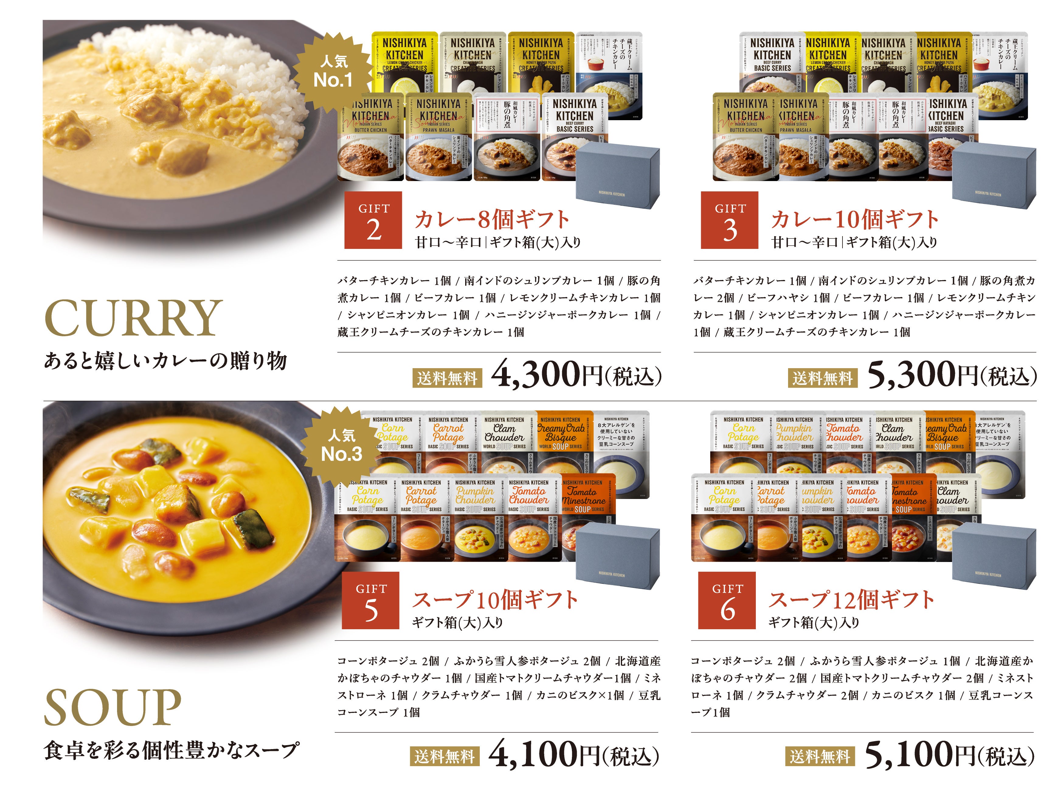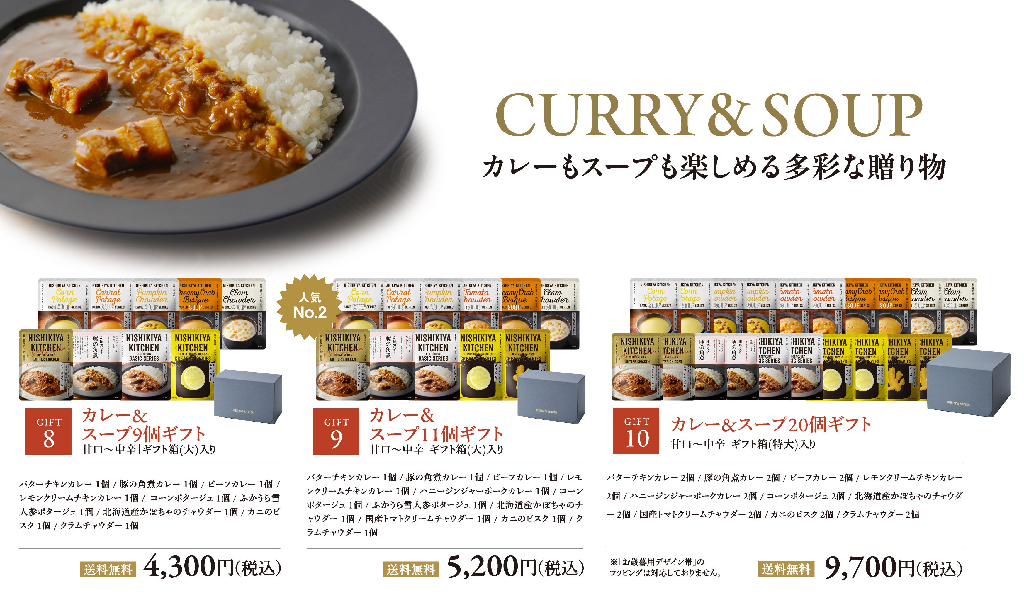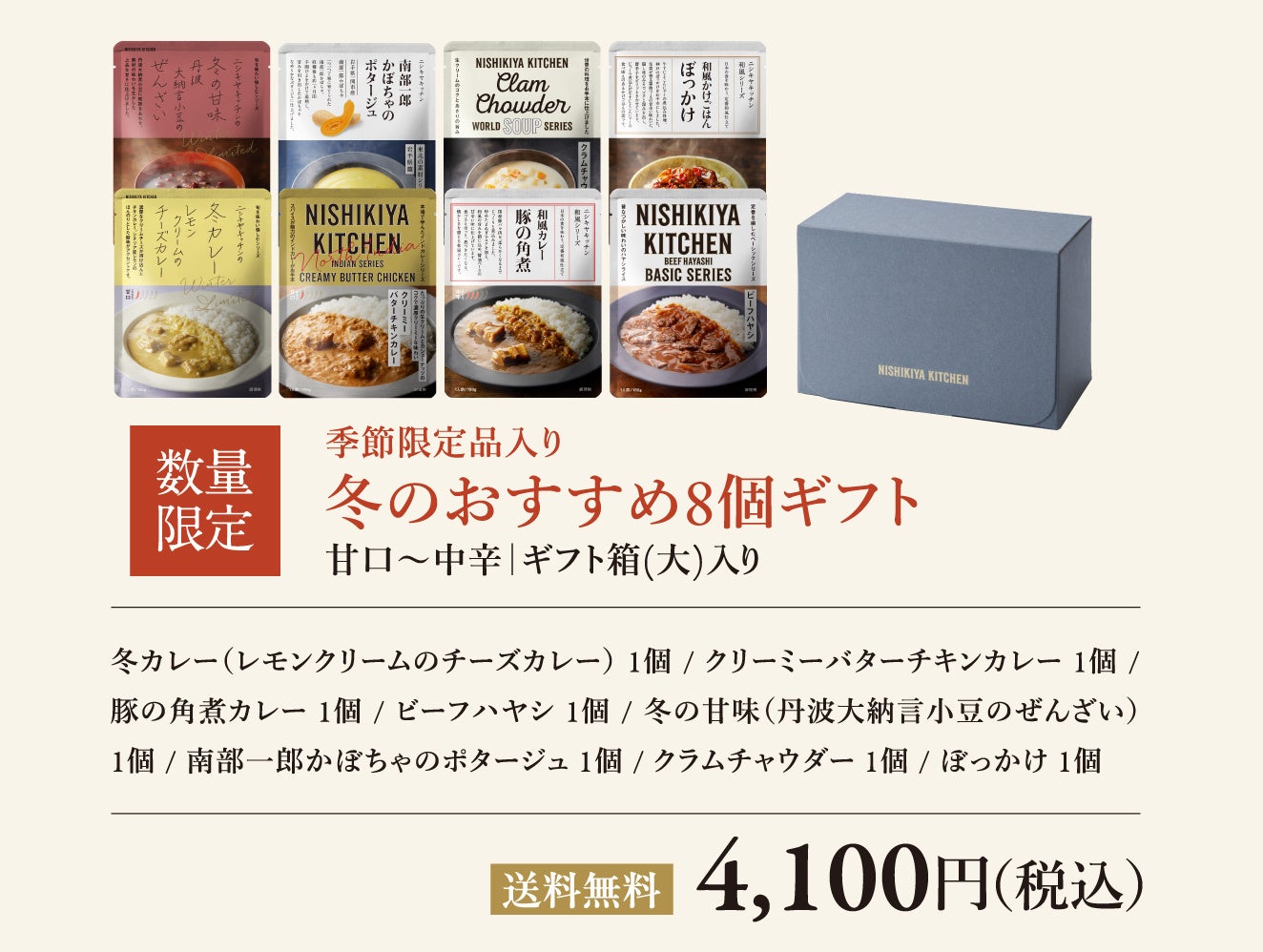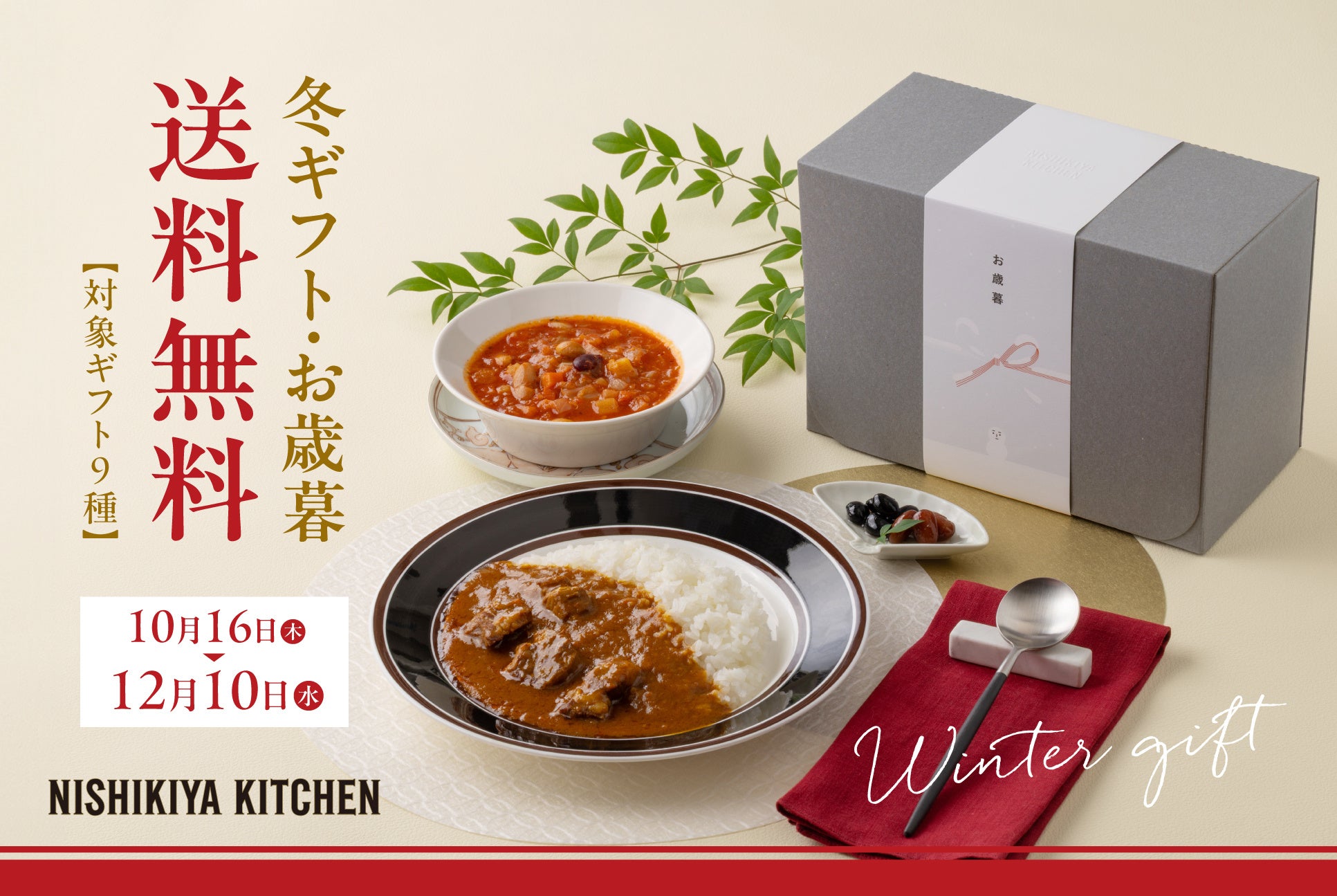 「世界の料理を『カンタン』に。」をコンセプトに掲げ、レトルトカレーを中心に約120種類のレトルト食品を販売する専門店NISHIKIYA KITCHEN(ニシキヤキッチン)(株式会社にしき食品 本社:宮城県岩沼市、代表取締役社長:菊池洋一)は、2025年10月16日(木)より、公式オンラインショップと実店舗限定で、対象のギフトセット9種類を送料無料でお届けするキャンペーンを開催します。ニシキヤキッチンでも人気の「バターチキンカレー」や「コーンポタージュ」が入った定番ギフトはもちろん、冬季限定商品の「冬カレー(レモンクリームのチーズカレー)」や「冬の甘味(丹波大納言小豆のぜんざい)」が入った「冬のおすすめ8個ギフト」も数量限定で販売。また、12月10日(水)までのキャンペーン期間中は、送料が通常740〜1,870円かかるところ対象ギフトを送料無料でお届けします。公式オンラインショップでは「eギフト」も期間中、対象ギフトが送料無料です。ニシキヤキッチンのレトルト食品は、素材や製法へのこだわりなど贈る相手への気遣いと、専門店ならではの豊富なメニュー数・スタイリッシュなパッケージデザインが “贈る側の安心感”と“受け取る側のワクワク感”を提供できるギフトとして、年々多くのお客様から喜びの声を頂戴しています。お歳暮ギフトだけでなく、親しい方へのお礼・感謝を伝えるギフトとしても、幅広くご利用いただき、ギフトを受け取った方からのアンケート結果では満足度96%*と大変好評です。