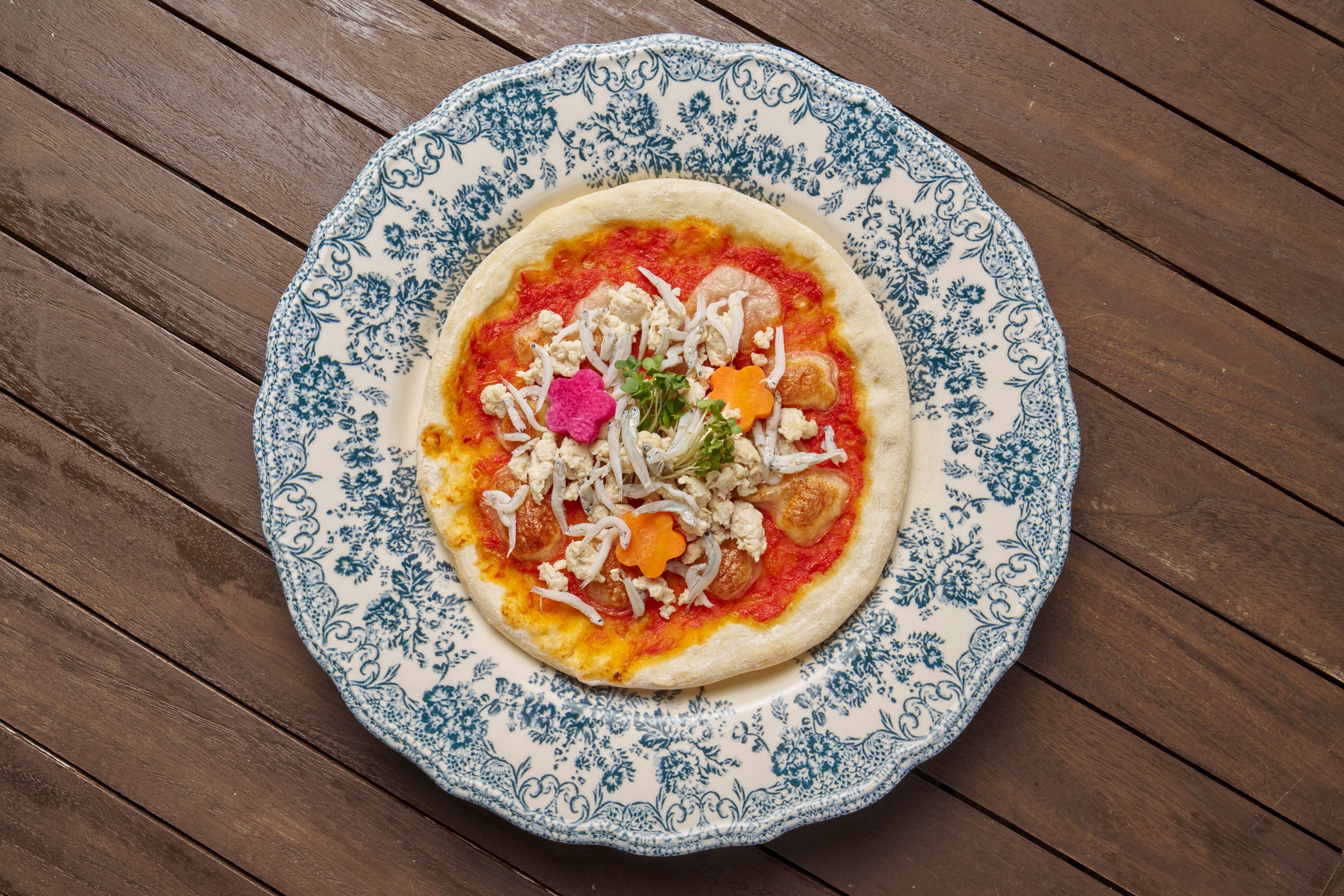 鶏肉やしらす、地元野菜をふんだんに使用したマルゲリータ。トッピングに犬も食べられるチーズを使用して、見た目も華やかで愛犬も喜ぶごはんです。