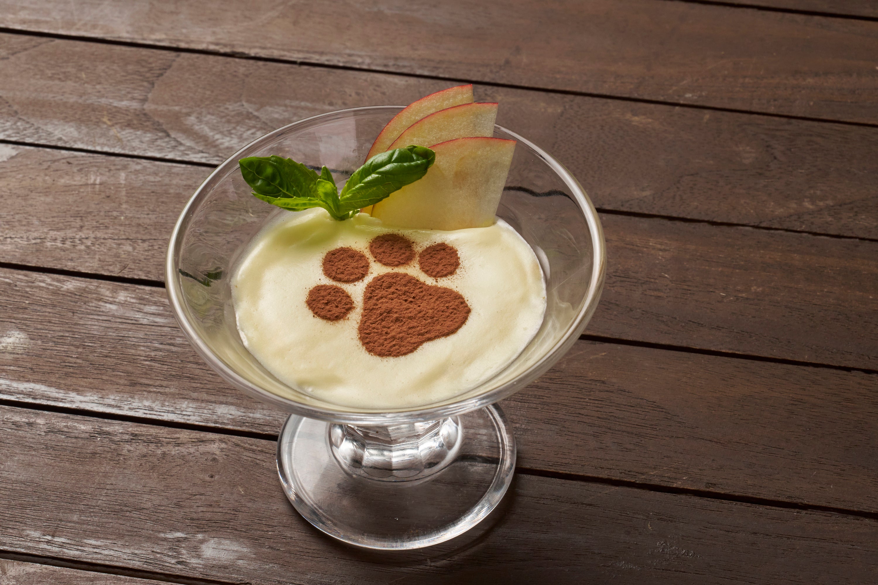 豆腐やおからパウダーを使用した犬にも優しいティラミス。デコレーションにはキャロブパウダーで描いたかわいい肉球マーク。見た目も可愛く愛犬も喜ぶデザートです。