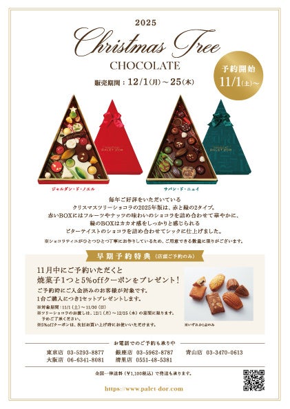 株式会社オヴァールリエゾン(本社:大阪府吹田市、代表取締役 三枝俊介)が展開するショコラ専門店「ショコラティエ パレドオール」では、2025年11月1日(土)より、全国の直営店および公式オンラインショップにて、数量限定のクリスマスツリーショコラの早期予約受付を開始いたします。