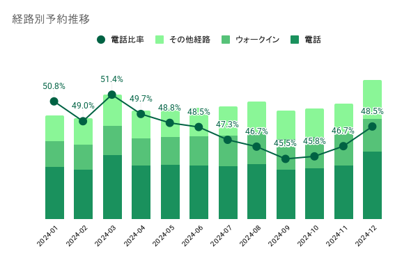 電話予約比率は1〜9月が45〜49%で推移していたのに対し、12月には48.5%に上昇