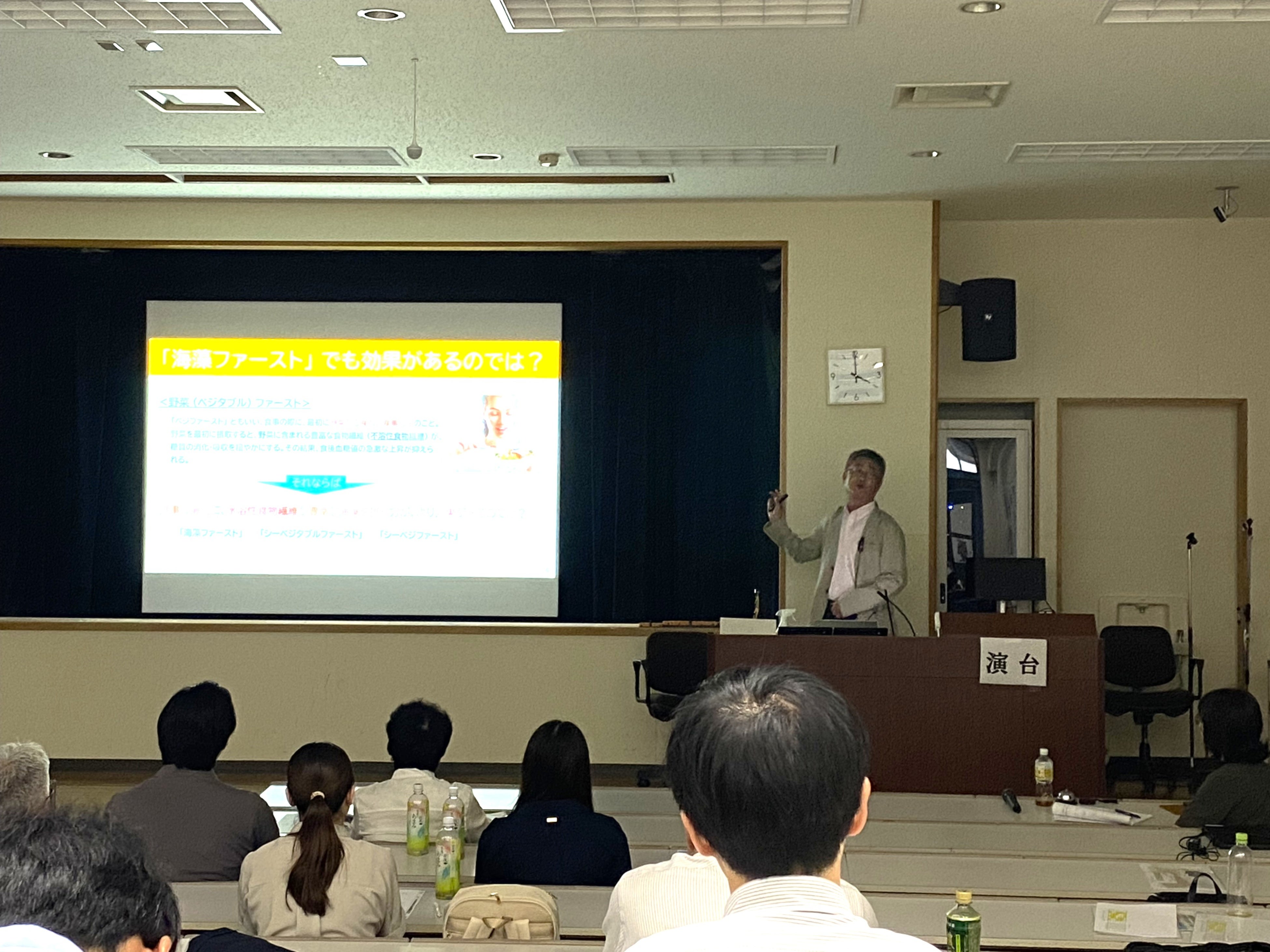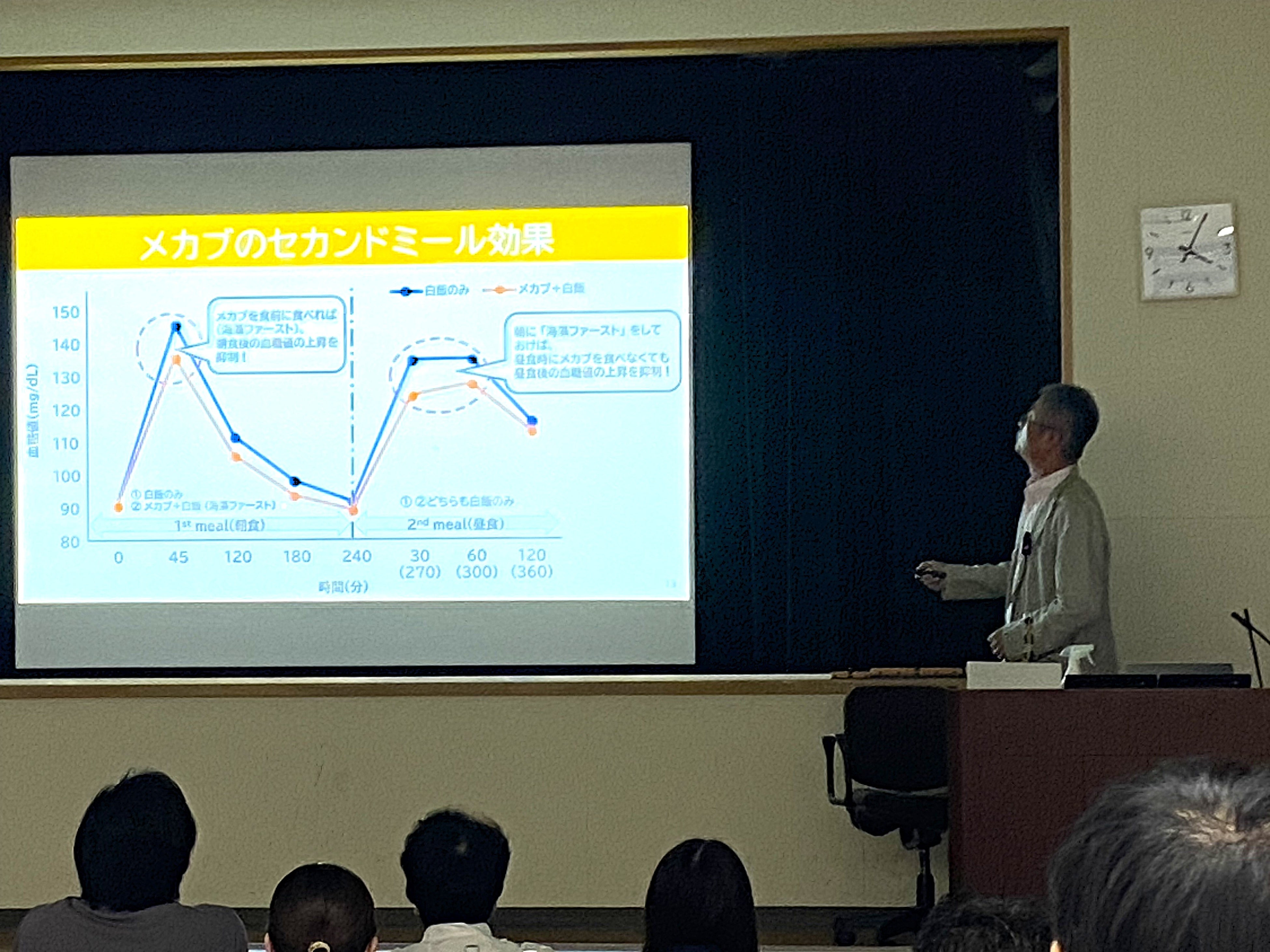 当社の吉積からは、「さぁ はじめるばい!『海藻ファースト』で塩・糖・脂対策!〜海藻の多糖類は、ほんにすごかねぇ!〜」と題し、食事の最初に海藻を摂取する“海藻ファースト”の健康効果について講演しました。現代社会では、食塩や糖質、脂質の過剰摂取が生活習慣病(糖尿病・高血圧・脂質異常症など)の発症リスクを高める三大要因とされています。当社海藻科学研究所のこれまでの研究で、食事の最初に海藻を摂ることで①食塩の排出を促し、高めの血圧を下げる、②食後の血糖値の上昇を抑制する、③食後の脂質の消化・吸収を穏やかにする効果があることがわかりました。また、朝食時に「海藻ファースト」を実践することで、昼食を摂った後の血糖値の上昇も抑える効果(セカンドミール効