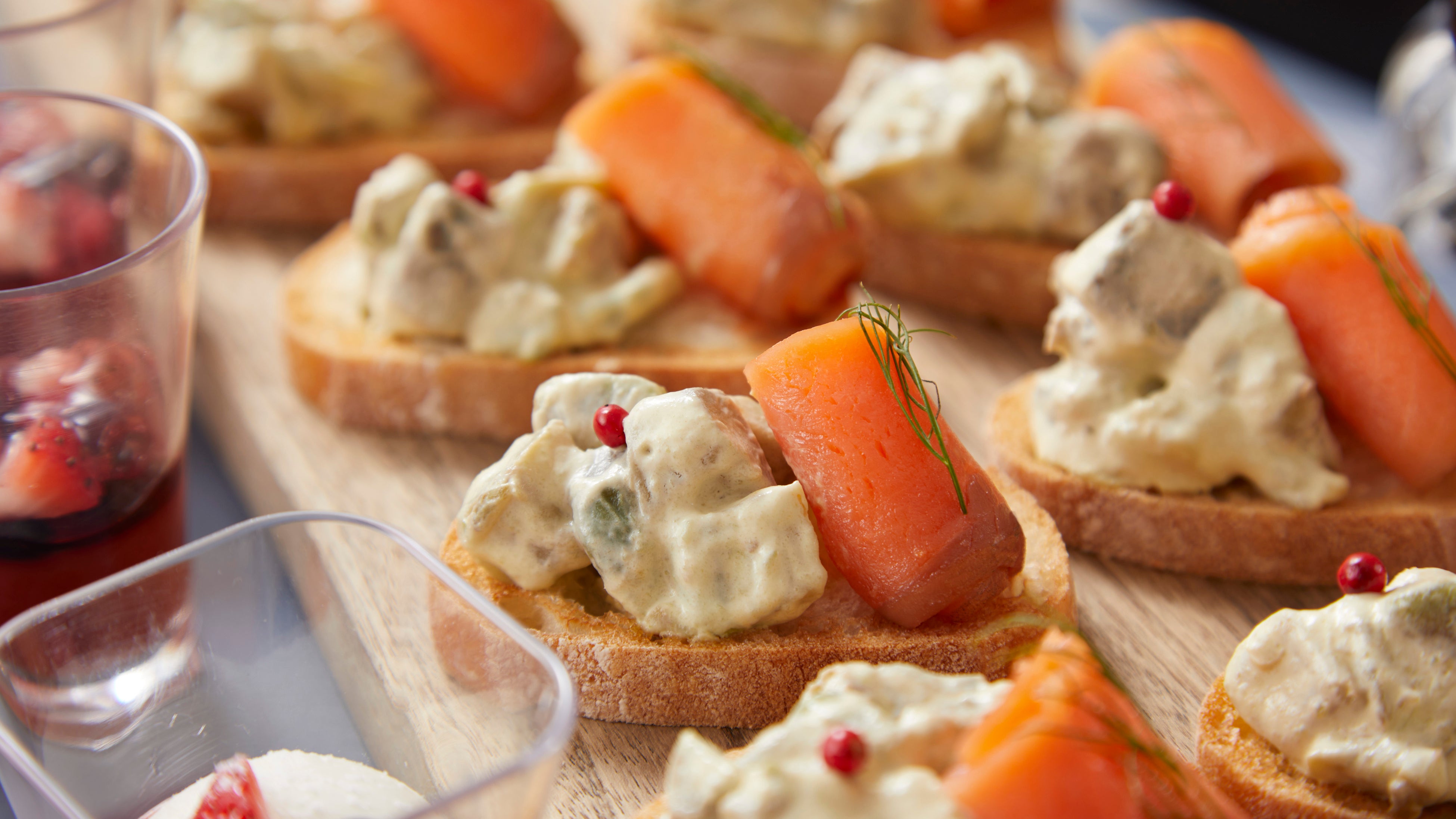 モッツァレラチーズとトマトのカプレーゼ / デコレーションポテトサラダ / スモークチーズ&ソフトサラミ / アボカドとサーモンのブルスケッタ ゴルゴンゾーラ風味 / 鴨とミカンの紅茶ジュレ