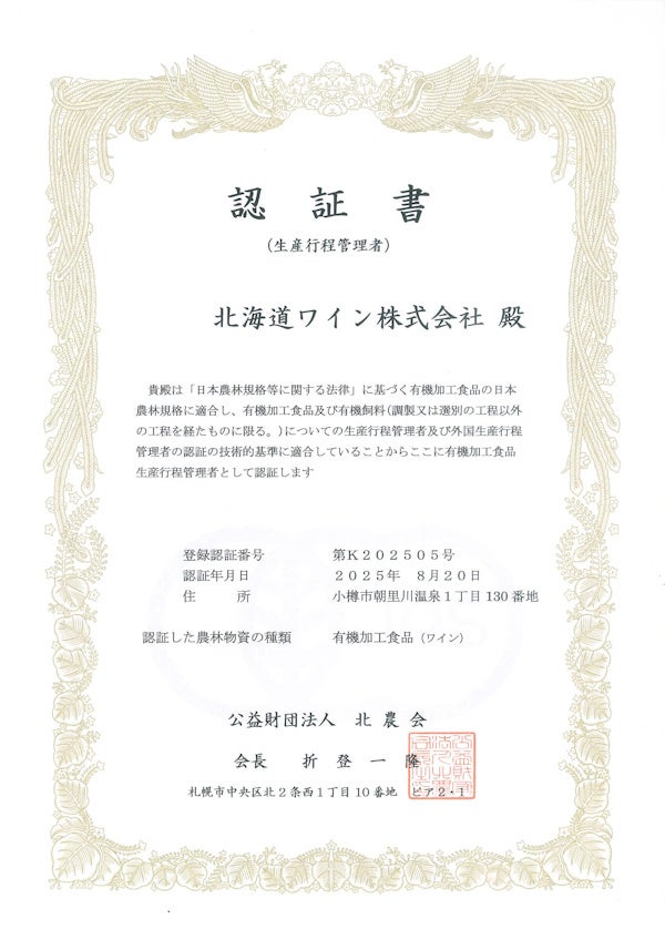 2025年8月 本社醸造所(小樽市)が有機加工食品(ワイン)の有機JAS認証を取得