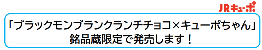 竹下製菓株式会社(以下「竹下製菓」)と九州旅客鉄道株式会社(以下「JR 九州」)は、この度「ブラックモン ブランクランチチョコ」と、JR 九州のポイント「JR キューポ」のインフルエンサーを目指す妖精「キューポちゃ ん」とのコラボ商品を発売いたします。 九州の「イイモノ」が豊富に揃う、お土産セレクトショップである銘品蔵での限定販売です。 また、販売期間中は「ブラックモンブランクランチチョコ×キューポちゃん」購入時に使用できるおトクな JR キューポアプリポイント付与クーポンをアプリ内で配布します。JR キューポアプリをダウンロードして、おトク にご利用ください。