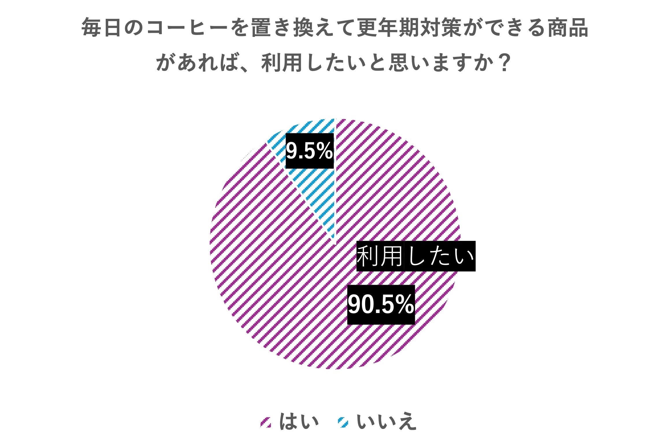 毎日のコーヒーを置き換えて更年期対策ができる商品があれば、利用したいと思いますか?」という質問に対して、「はい」と回答した人は91.7%に上りました。これは、更年期に対して不安を感じながらも具体的な対策を講じられていない層が多く存在する中で、「日常の習慣を無理なく変える」という手軽な方法へのニーズが極めて高いことを示しています。