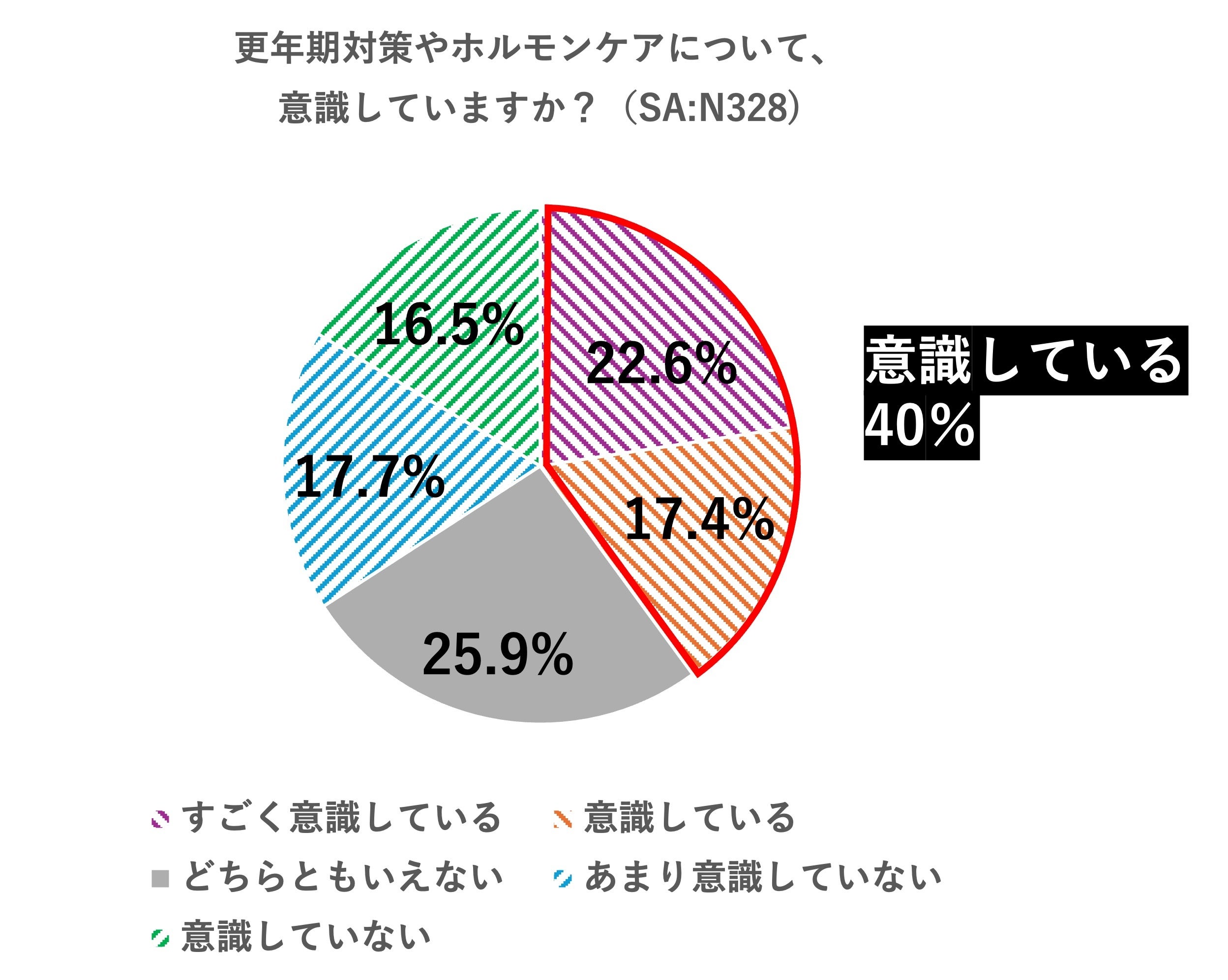 更年期対策やホルモンケアに対する「意識」は、「すごく意識している」(22.6%)と「意識している」(17.4%)を合わせて40.0%でしたが、「どちらともいえない」も25.9%と高い水準でした。