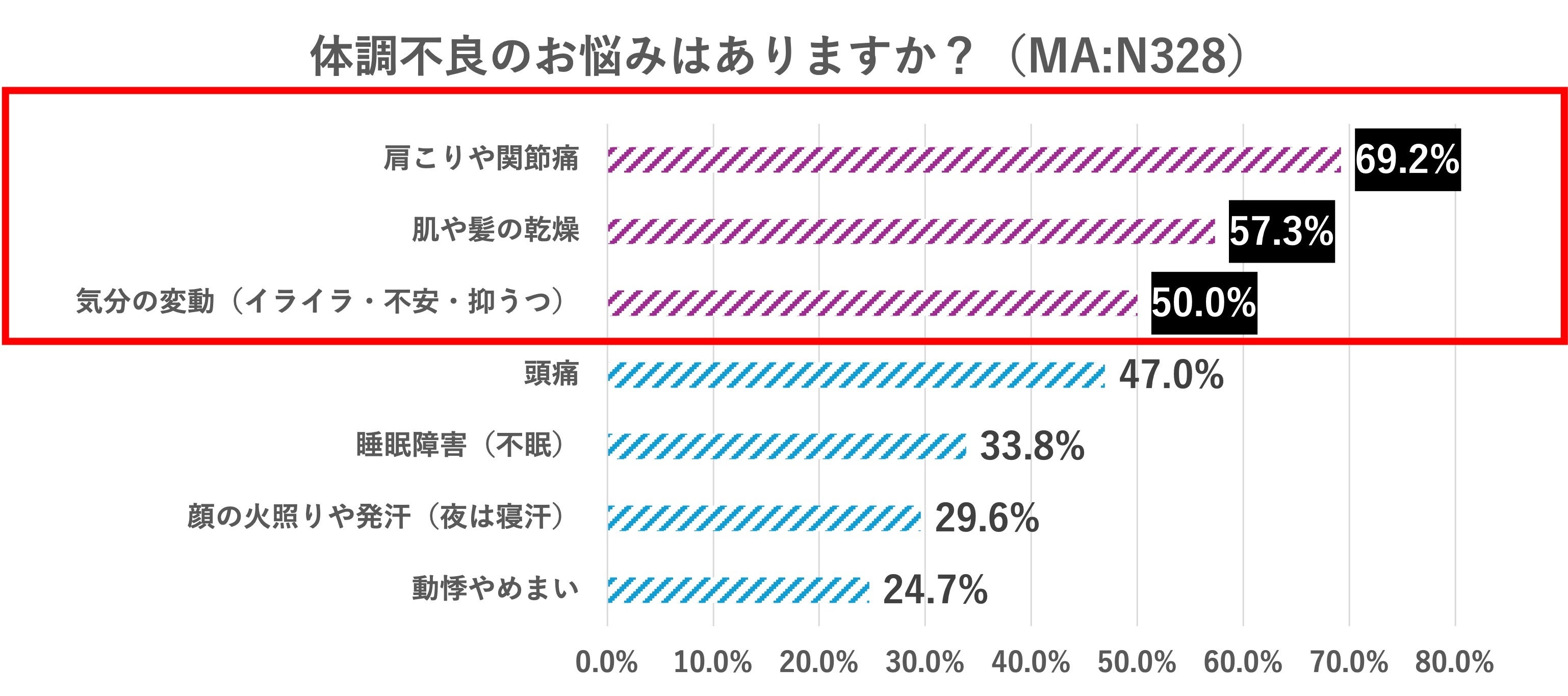 具体的な不調の悩みとして、「肩こりや関節痛」(69.2%)、「肌や髪の乾燥」(57.3%)、「気分変動」(50.0%)が上位3位。