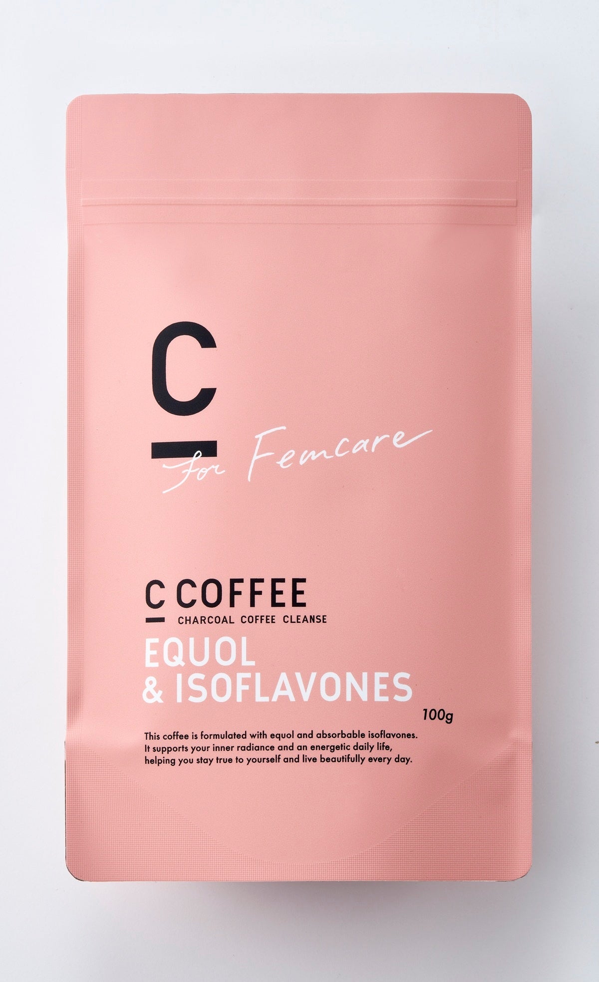 「C COFFEE EQUOL & ISOFLAVONES」にはシリーズ共通成分のチャコールに加え、大人女性をいたわる成分としてエクオールとイソフラボンを配合。さらに体に負担となるカフェインを可能な限り減らしたコーヒーです。