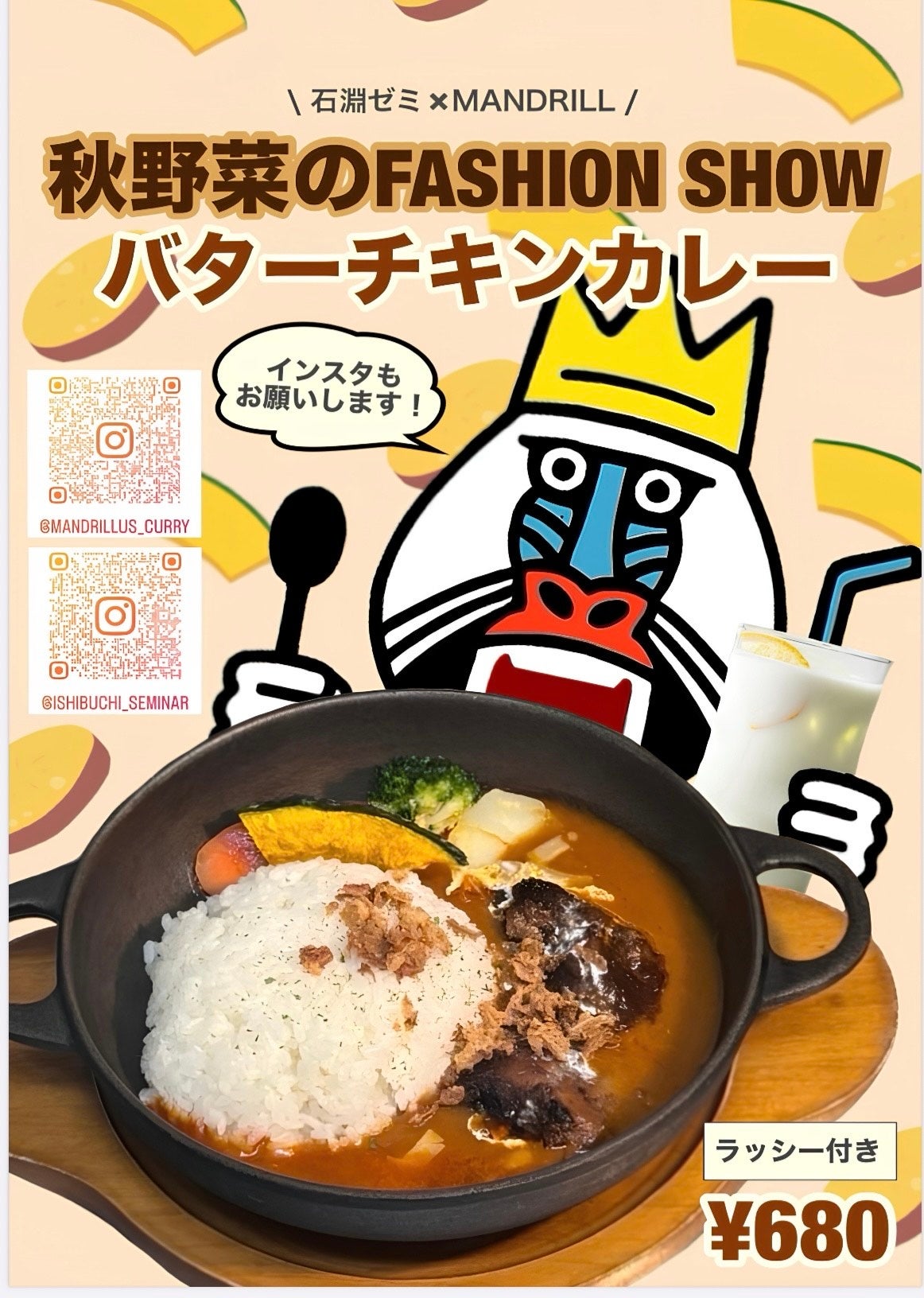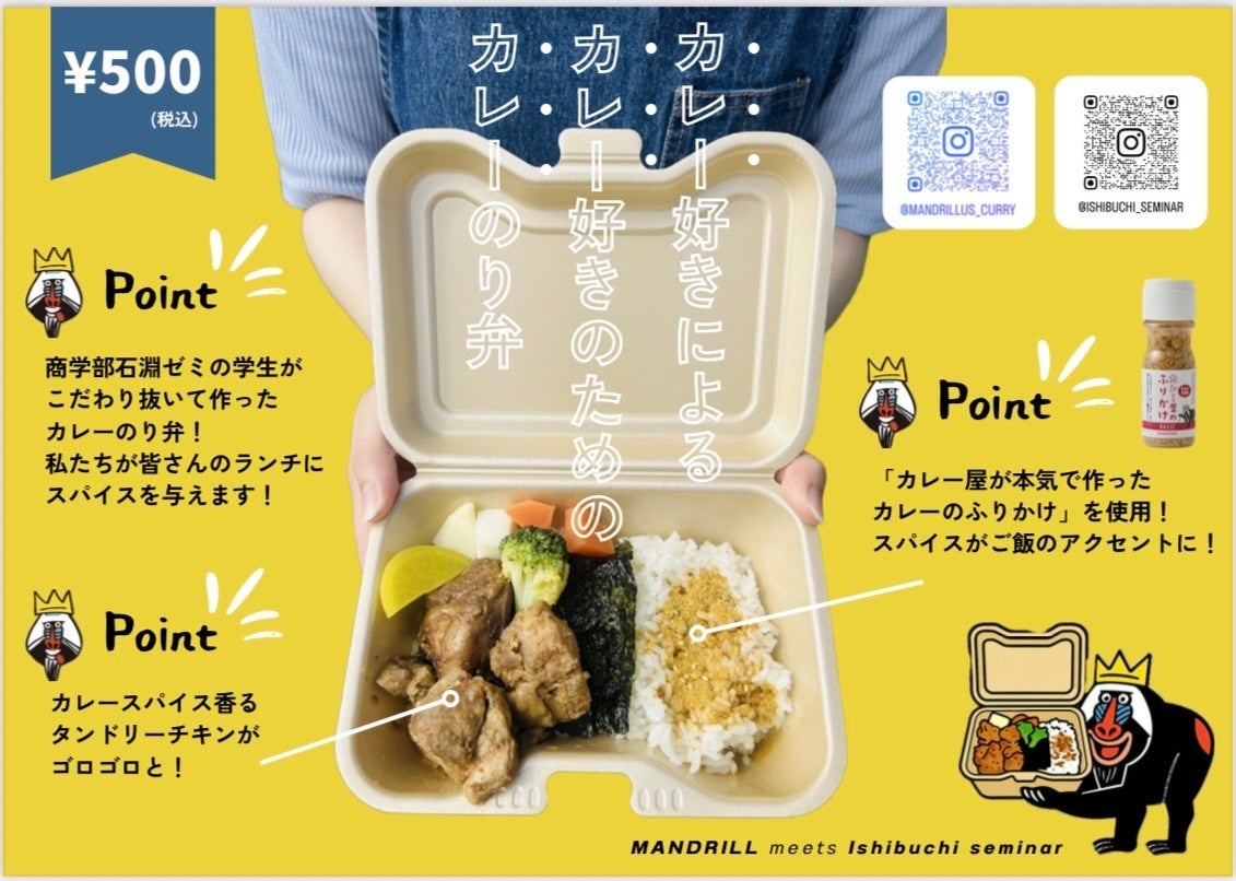 神戸発のカレー専門店「マンドリルカレー」は、関西学院大学 商学部 石淵ゼミと共同で産学連携プロジェクトを実施しました。学生の自由な発想とカレー専門店のスパイス技術を掛け合わせ、「カレー好きによるカレー好きのためのカレーのり弁」 を開発。学内イベントや販売会で500円(税込)にて提供します。さらに、H号館「鉄鍋キッチン by マンドリルカレー」では、「秋野菜のFASHION SHOW バターチキンカレー」 を限定販売いたします。