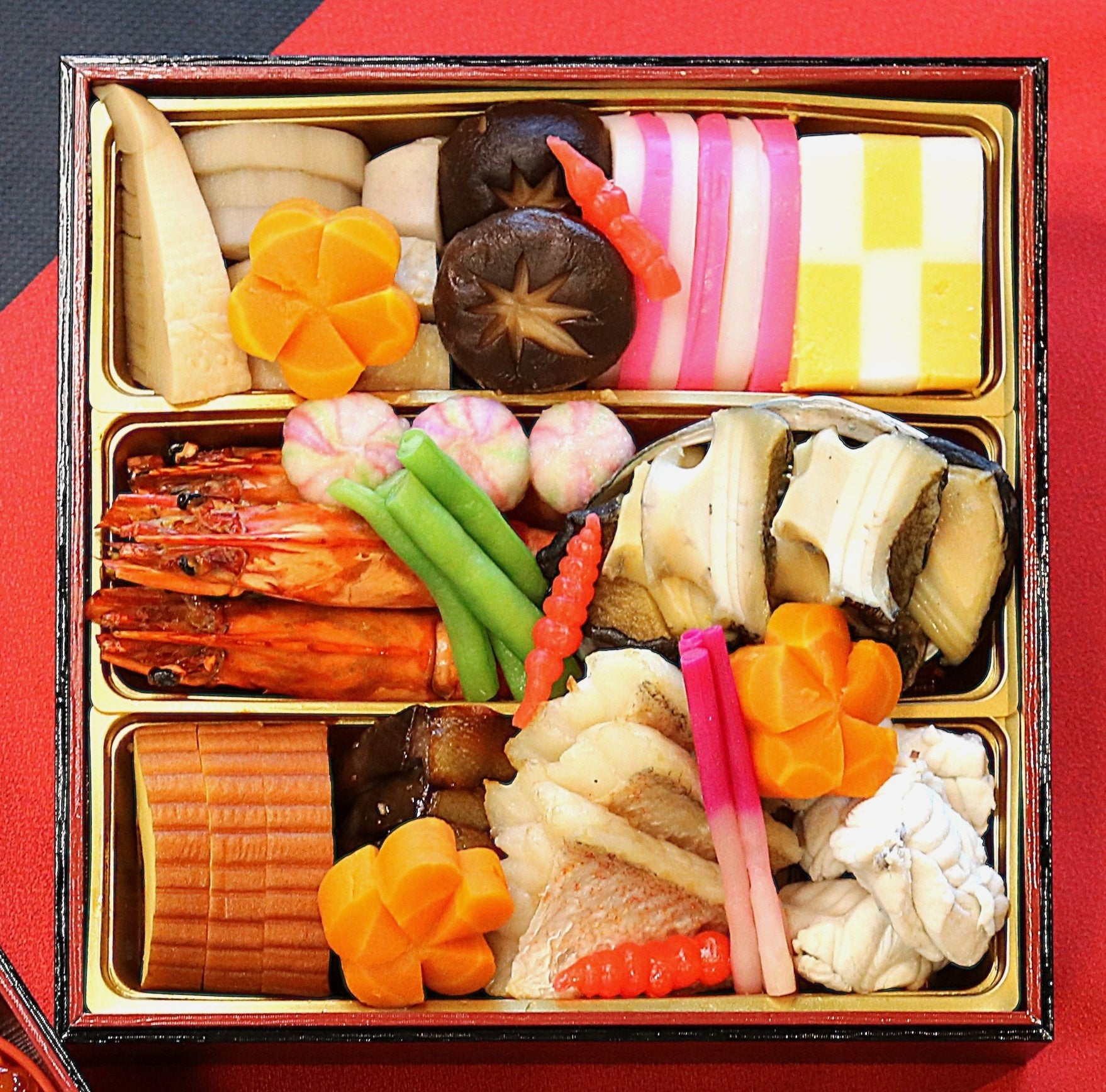 紅白かまぼこ、錦玉子、海老若狭焼き、鮑酒蒸し、伊達巻き、鰤西京焼き、甘鯛塩麴、河豚塩煮、手まり麩、炊き合わせ(筍、椎茸、蓮根、里芋、人参、印元)、丁呂木、はじかみ