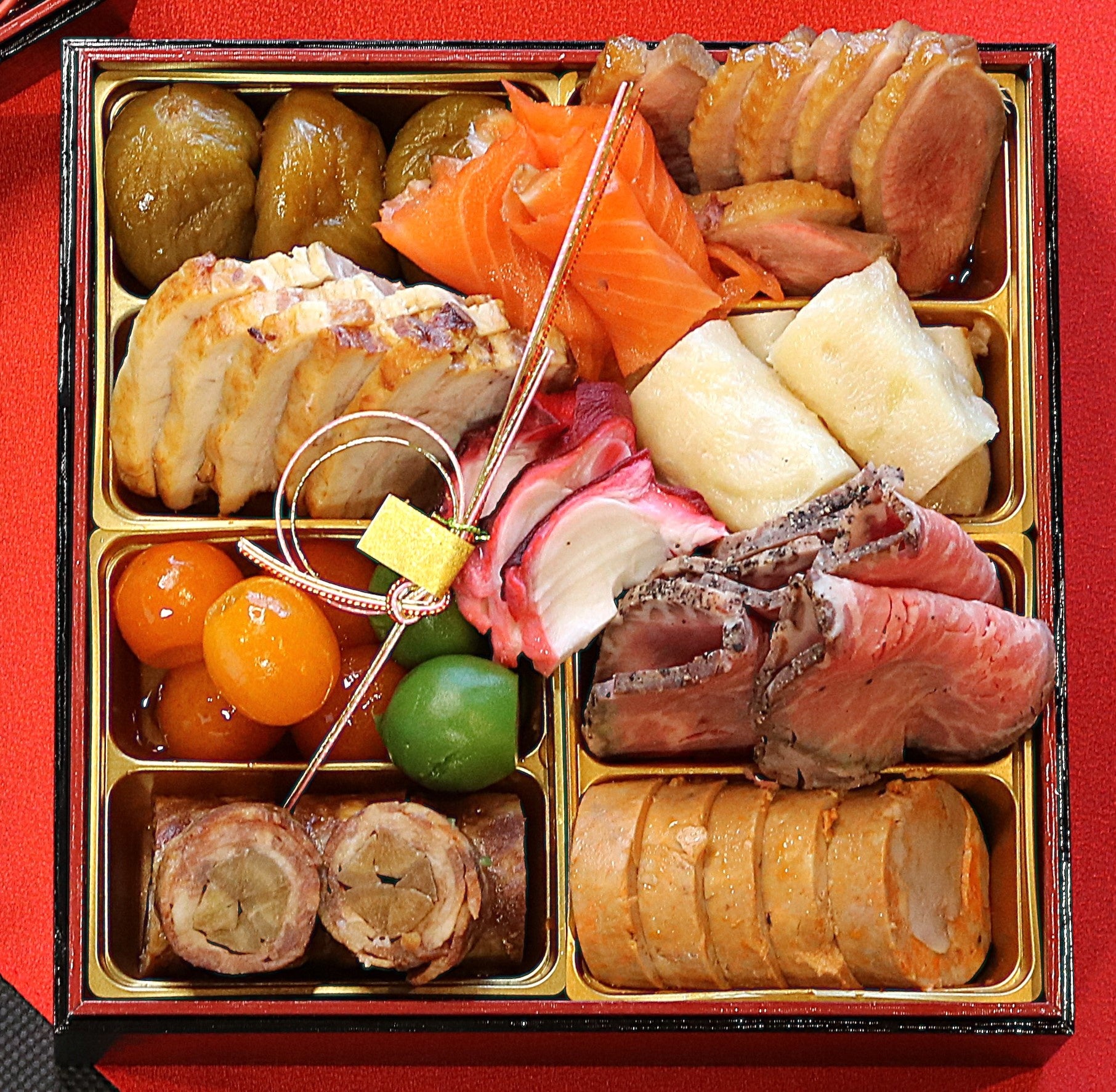 無花果甘露煮、合鴨ロース煮、スモークサーモン、焼豚、海老東寺巻、金柑、若桃甘露煮、ローストビーフ、牛八幡巻き、あん肝、酢蛸