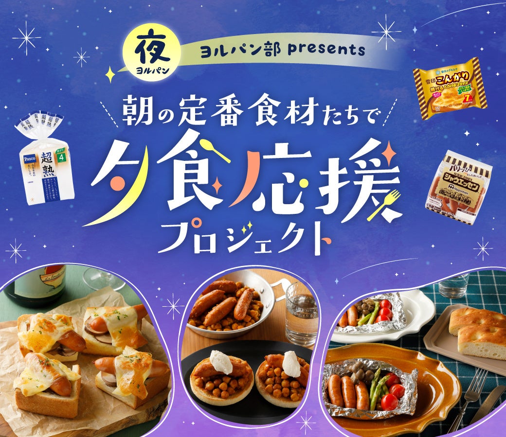 敷島製パン株式会社(Pasco)は、夜(夕食)にパンを食べることを「ヨルパン」として提唱し、世の中に広めるべく活動している「ヨルパン部」の取り組みの一つとして『ヨルパン部presents 朝の定番食材たちで「夕食応援プロジェクト」』を開始します。